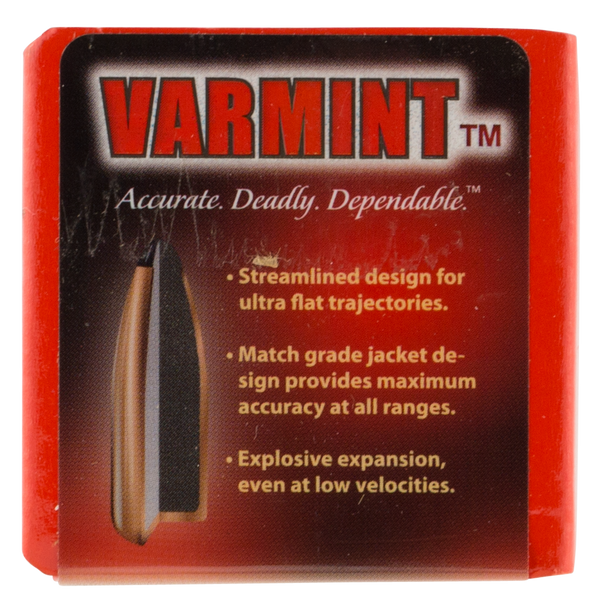 The hornady traditional varmint bullets features a streamlined design for flat trajectory.Its lead core and match-grade copper jacket represent the original standard created by joyce hornady for classic varmint hunting.Primarily comprised of spire point profiles and flat base designs, the bullets perform extremely well even at low velocities and deliver excellent performance in many classic varmint rifles.