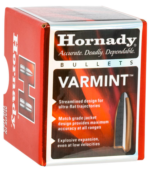 The hornady traditional varmint bullets features a streamlined design for flat trajectory.Its lead core and match-grade copper jacket represent the original standard created by joyce hornady for classic varmint hunting.Primarily comprised of spire point profiles and flat base designs, the bullets perform extremely well even at low velocities and deliver excellent performance in many classic varmint rifles.