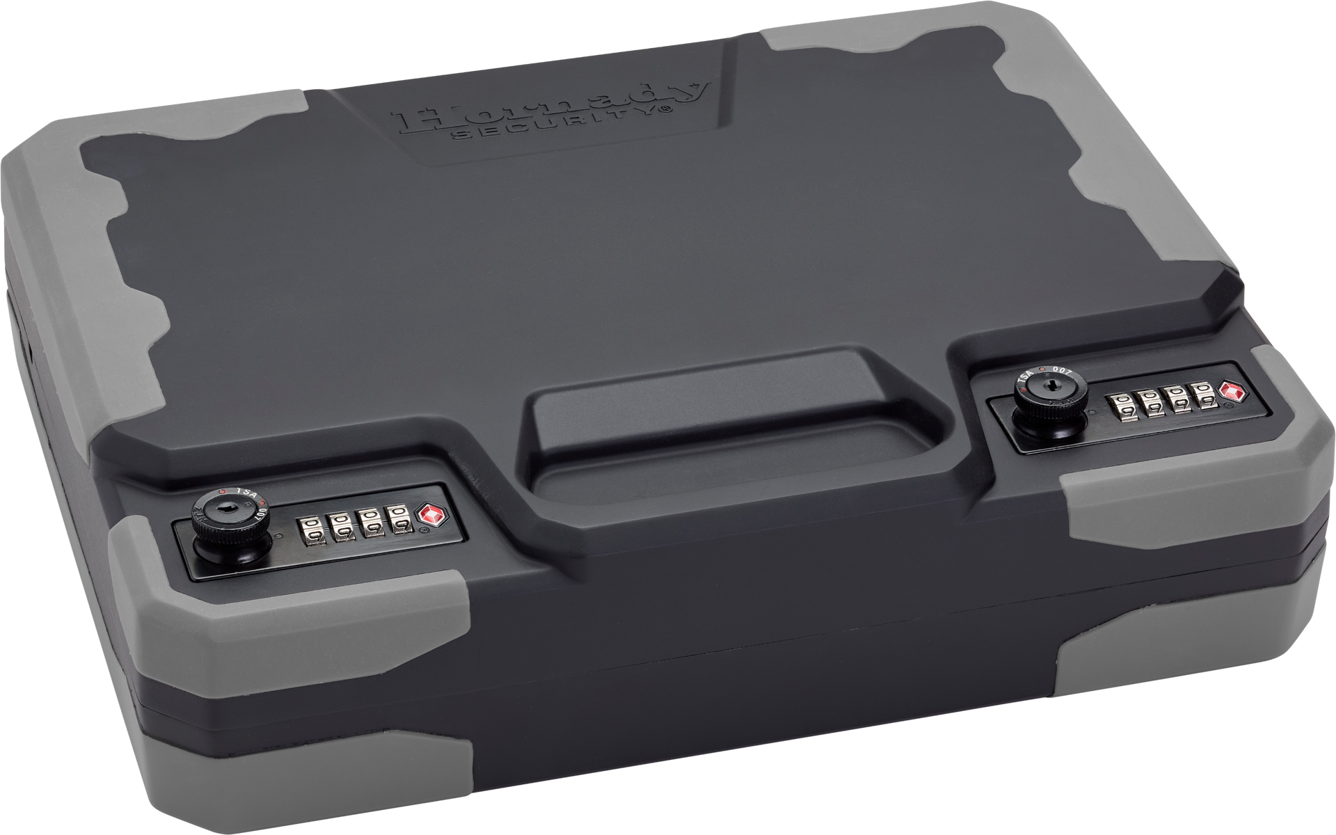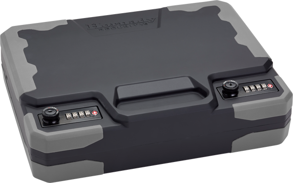 Hornady treklite lock box xxl protects firearms, ammo and other valuables while traveling or at home.Featuring dual four digit tsa lock that offers advanced security and 10,000 user programmable codes; advanced, impact-resistant polycarbonate for exceptional toughness; fits up to two full-sized 1911 handguns; durable, non-slip rubber over mold provides added impact protection and stability.Sized to fit 8.5" x 11" documents.Includes 1500 lb.Rated security cable with patented cable connector that maximizes cargo space.