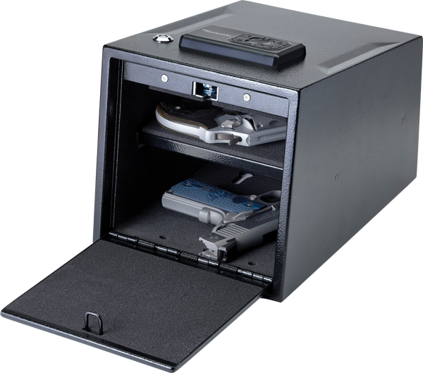 The 2-gun keypad vault's removable shelf provides twice the interior space while it fits neatly on a desk or nightstand.Program a four- to six-digit code to ensure security, or use the key lock backup.It is constructed of thick 16-gauge steel, and has a protective foam liner on the interior.It has an interior light automatically illuminates when opening the safe, and a programmable 4 to 6...View more