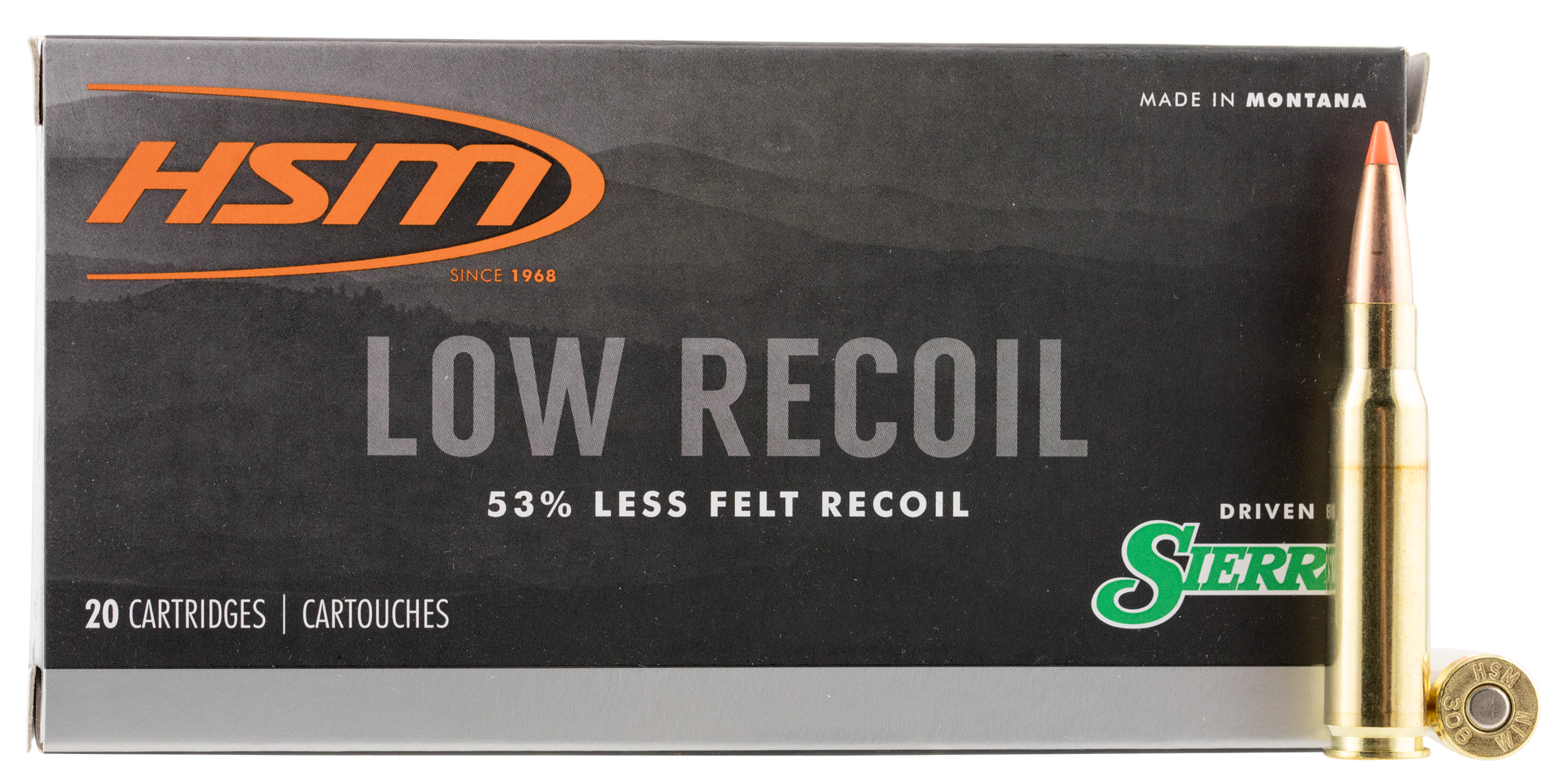 The hsm low recoil rifle rounds all feature full, standard weight for caliber hunting bullets.There is no compromise in performance and accuracy when compared to bullets found topping other low-recoil ammunition.Hsm partnered with world-renowned sierra bullets in developing these hsm proprietary bullets featuring a distinct hsm orange polymer tip.They are as technologically advanced as has yet been encountered.Specifications: 308 win/150 gr/orange polymer tip/20 per box/25 cs