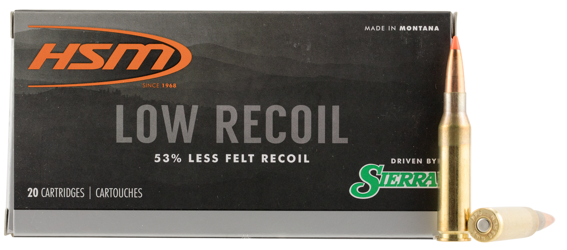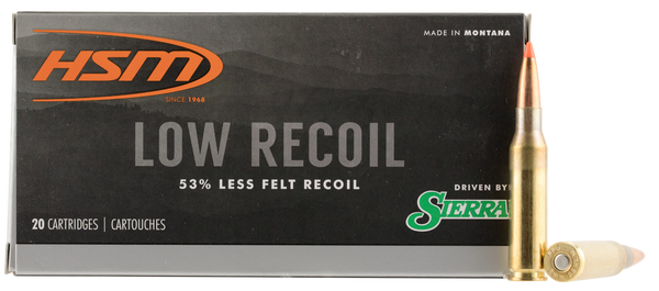 The hsm low recoil rifle rounds all feature full, standard weight for caliber hunting bullets.There is no compromise in performance and accuracy when compared to bullets found topping other low-recoil ammunition.Hsm partnered with world-renowned sierra bullets in developing these hsm proprietary bullets featuring a distinct hsm orange polymer tip.They are as technologically advanced as has yet been encountered.Specifications: 7mm-08 rem/140 gr/orange polymer tip/20 per box/25 cs