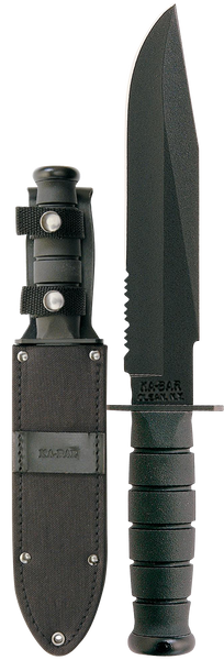 Ka-bar's full-size fighter knife with a black blade and black kraton g handle.The clip point blade is a classic shape and very practical.The shape seems to have a portion of the spine of the blade clipped off which brings the blade point lower for extra control and enhances the sharpness of the tip.It provides ample "belly" in the blade for slicing or skinning and a good tip for inserting in and under things that need to be cut.Includes sheath.Made in the usa.