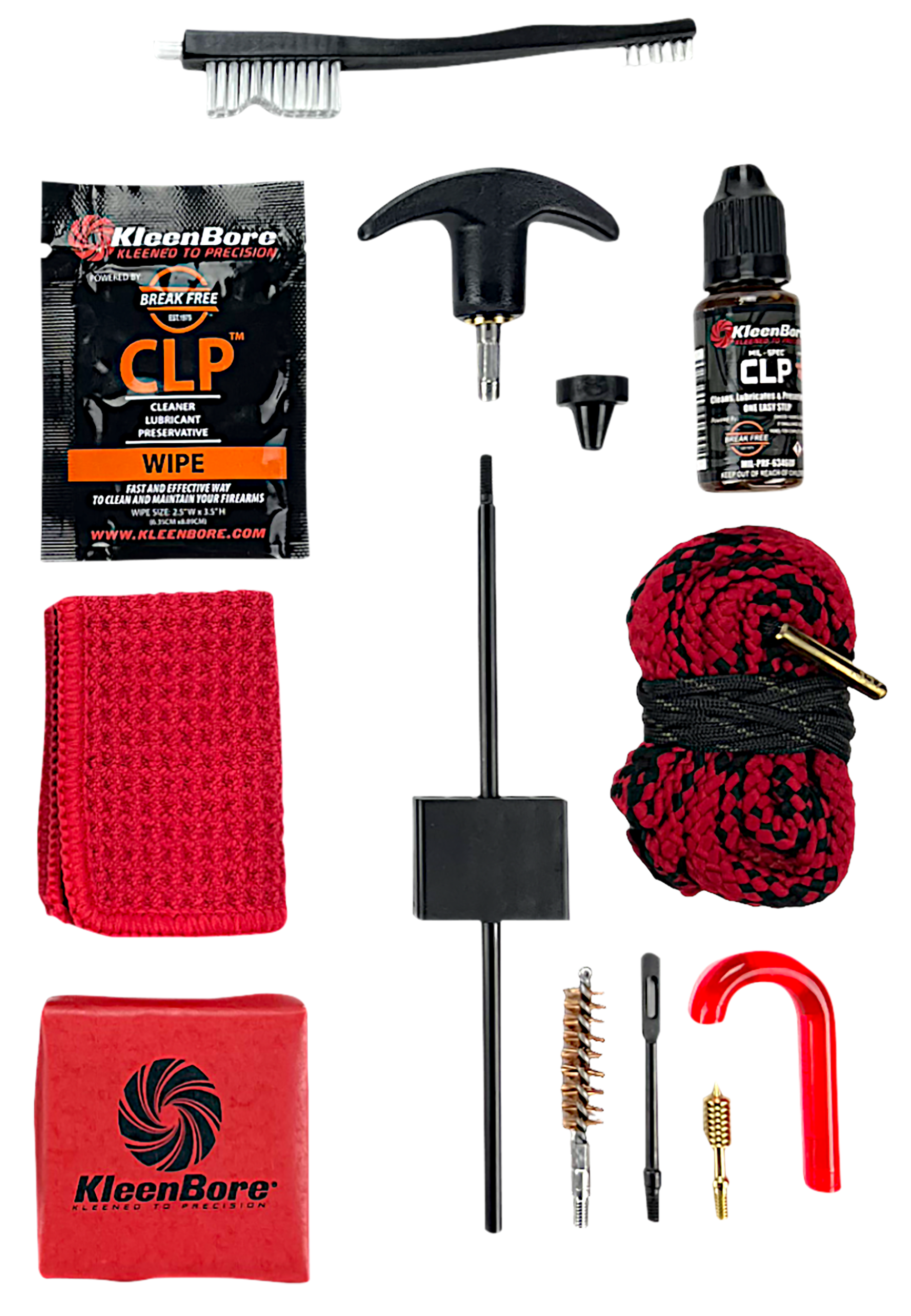 The kleenbore dual cleaning system handy kit includes includes kleenbore rigid steel cleaning rods w/swivel handle, rod extension, kwik-kleen one pull through rope cleaner, muzzle guard, patch holder, bronze bore brush, barbed point jag, cotton flannel cleaning patches and double end nylon utility brush.