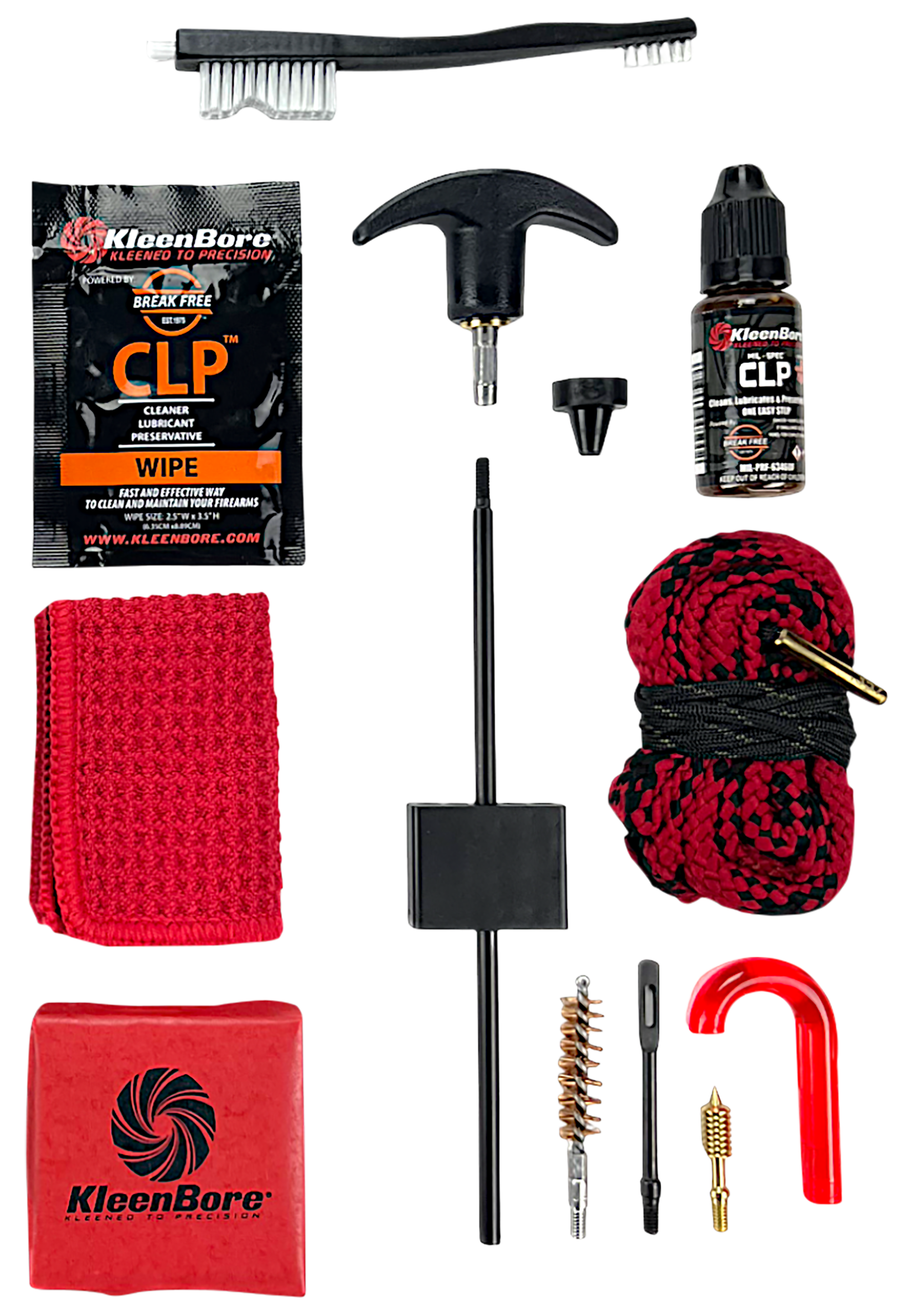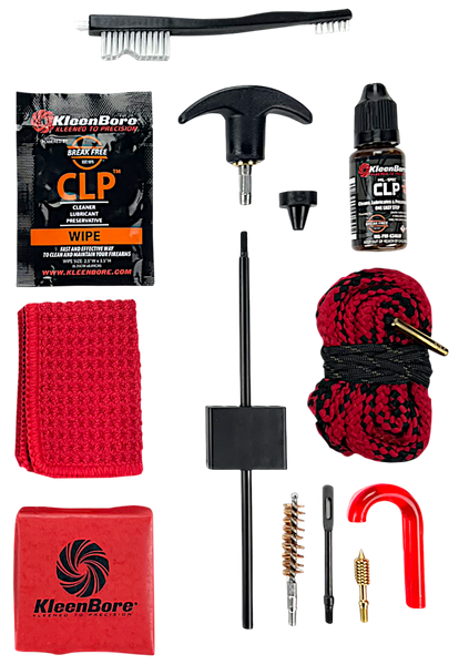 Kleenbore dual kleen.38/.357/9mm cleaning rod and pull through system.Kit includes 6.5 kleenbore rigid coated rod w/swivel t-handle, rod extension, kwik-kleen one pull through rope cleaner, muzzle guard, phosphor bronze bore brush, patch holder, cotton flannel cleaning patches and double end nylon utility brush.