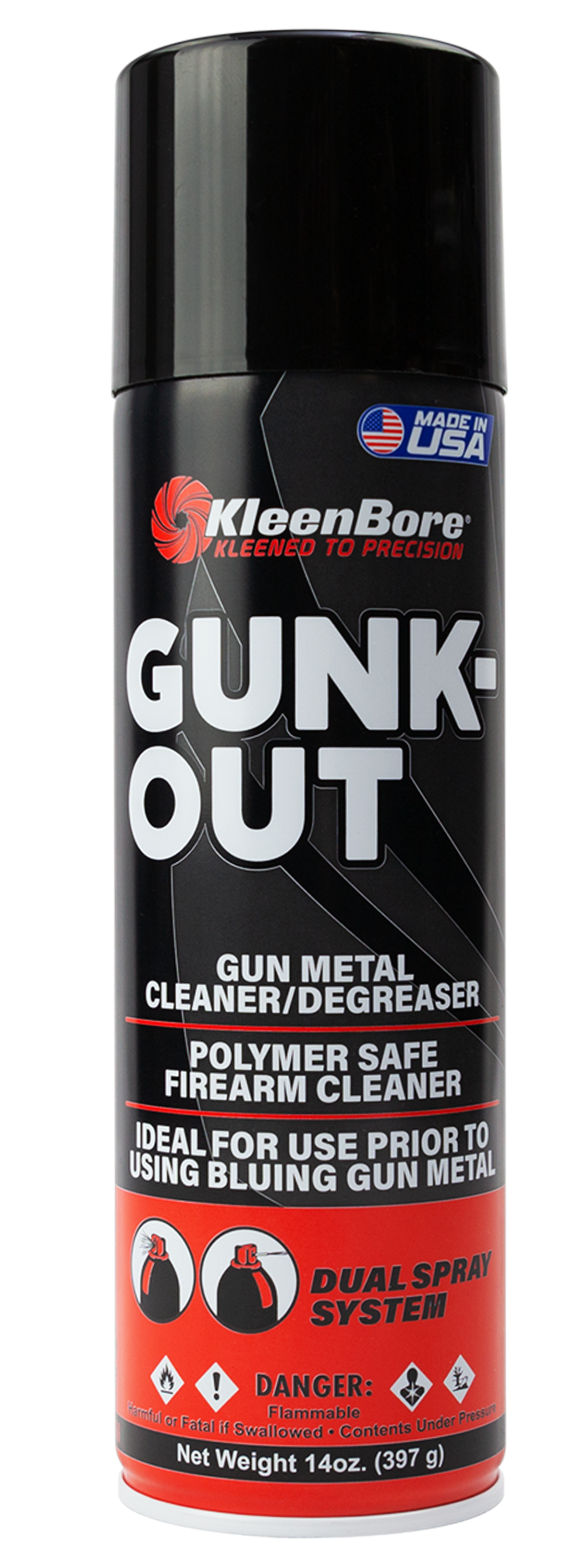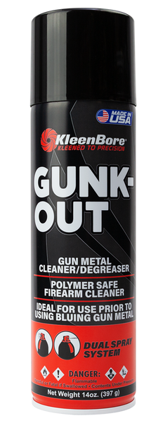 Gunk-out quickly evaporate and blasts away caked-on oil contaminated dirt, dust and powder residues.Solves most malfunction problems.Kleenbores gunk-out makes cleaning modern firearms easier and faster.Cleans fast and will not harm plastic, wood, laminates, composites, rubber grips or any other material including camo finishes.Use oil after use of gunk-out on all metal surfaces and metal to metal contact points, as gunk-out removes all oil/grease from metal...View more
