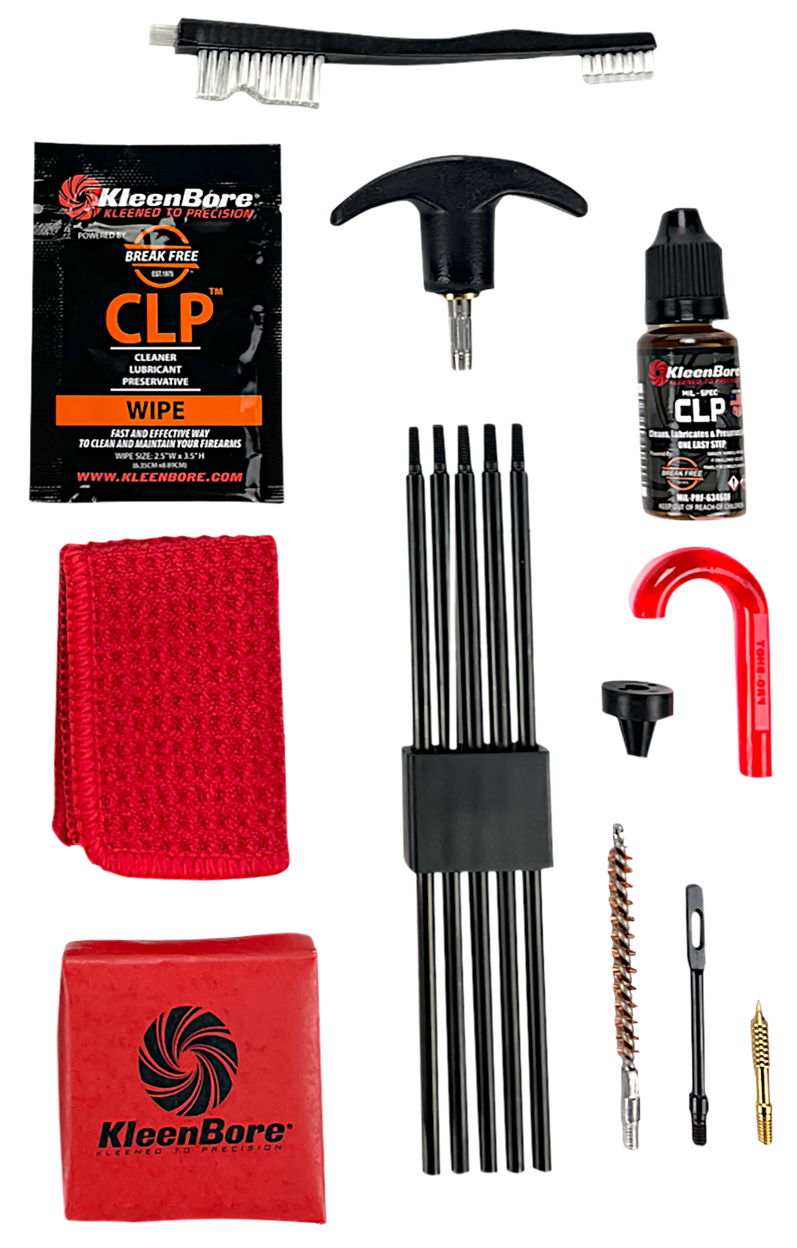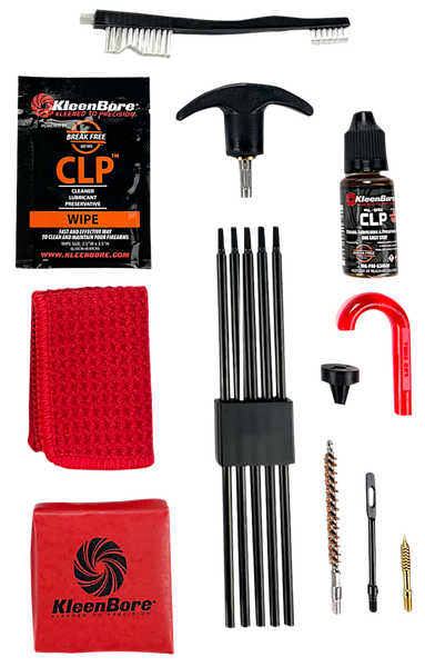 The classic cleaning kit includes: 30" kleen-bore rigid black rod with swivel handle; rod accessory adaptor to accept #8-32 threads; double end nylon bristle brush; 2 oz brekfree clp; black steel patch holder; phosphor bronze bore brush; polymer muzzle guard; silicone cloth; cotton cleaning patches all in a polypropylene case.Caliber Or Gauge: 22,223,5.56Bristle Type: NylonLength: 30"Thread Pattern: #8-32Case Material: PolypropyleneView more