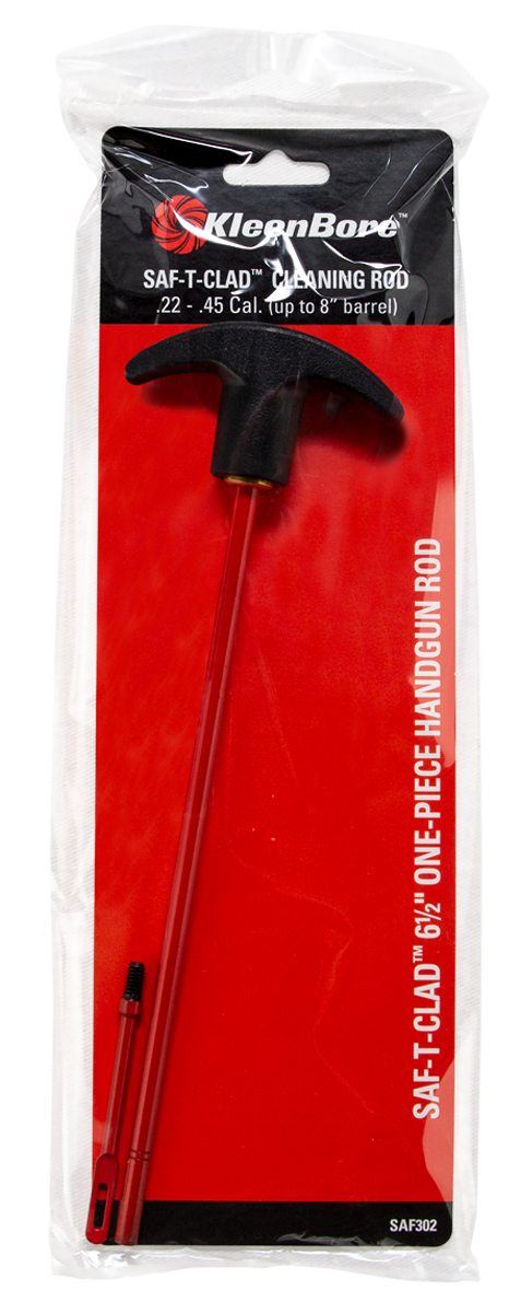 The kleen-bore saf-t-clad handgun rod is designed for 22-45 caliber handguns.Made of solid steel with saf-t-clad coating, swivel handle and is 6.50" long.Includes a saf-t-clad coated steel patch holder.