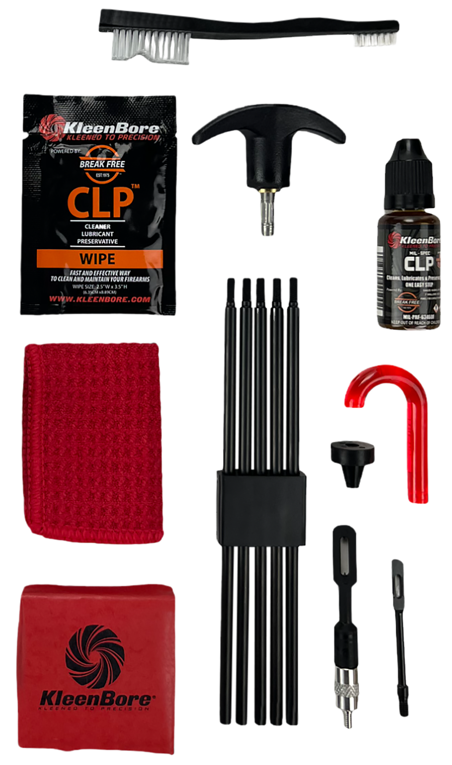The classic universal kit allows users the ability to clean firearms from 22 cal-12 gauge.The kit includes: 30" kleen-bore rigid black rods with swivel handle section; rod accessory adaptor to accept 8-32 threads; double end nylon bristle gun brush; black steel patch holder; aluminum shotgun adaptor; polymer shotgun patch holder; polymer muzzle guard; 2 oz breakfree clp; silicone cloth; cotton cleaning patches all in a polypropylene case.