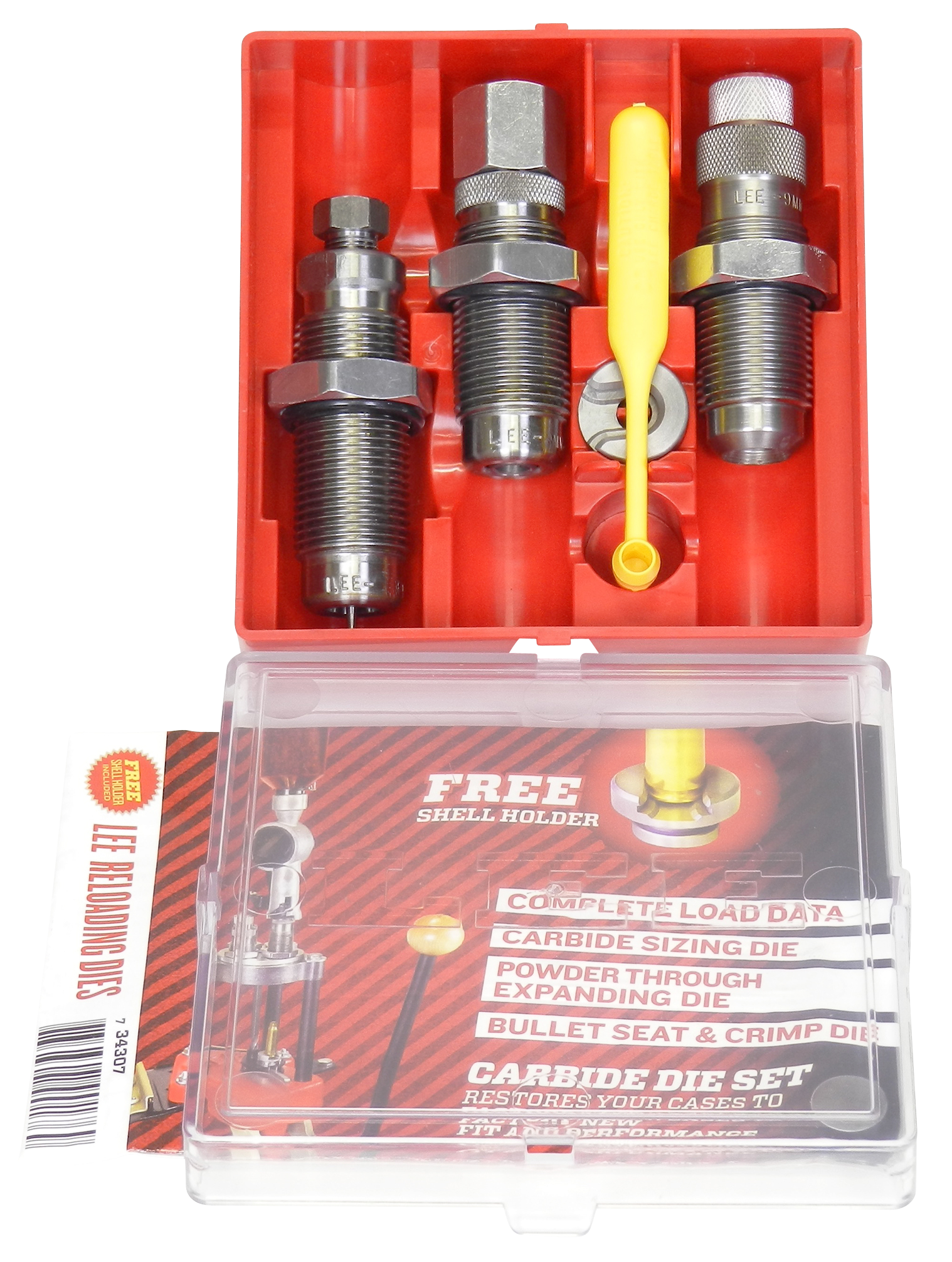 Lee's carbide 3-die set includes carbide full length sizing die, powder thru expanding die, universal shell holder, powder dipper and instructions/load data.