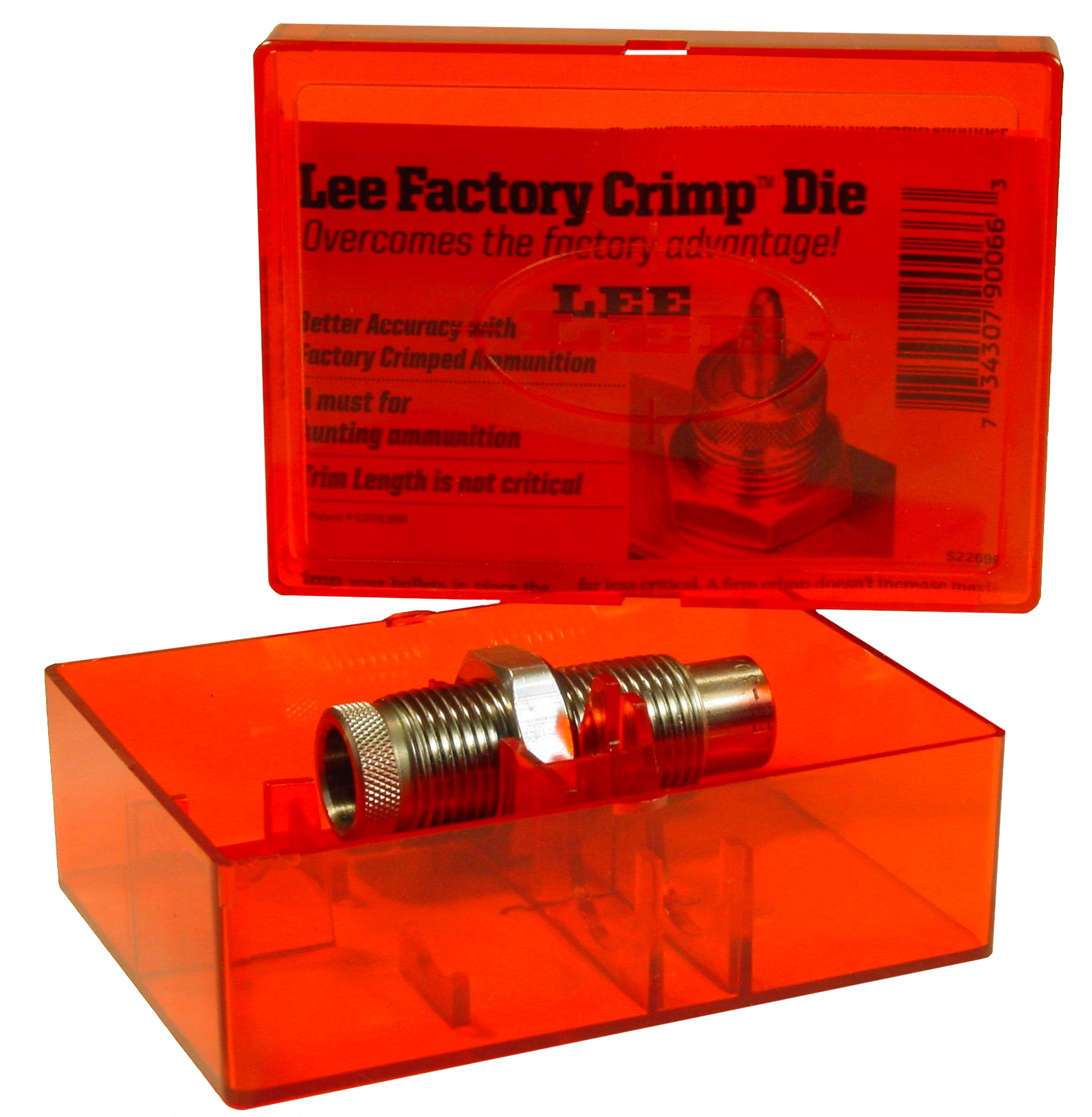 Lee's carbide factory crimp die sizes the cartridge while being crimped so every round will positively chamber freely with factory like dependability.This die applies a roll style crimp.The adjusting screw quickly and easily sets the desired amount of crimp.Trim length is not critical so this extra operation takes less time than it would if cases were trimmed and chamfered.A firm crimp is essential for dependable and accurate ammunition, as it eliminates the problems of poor ignition of slow burning magnum powders.
