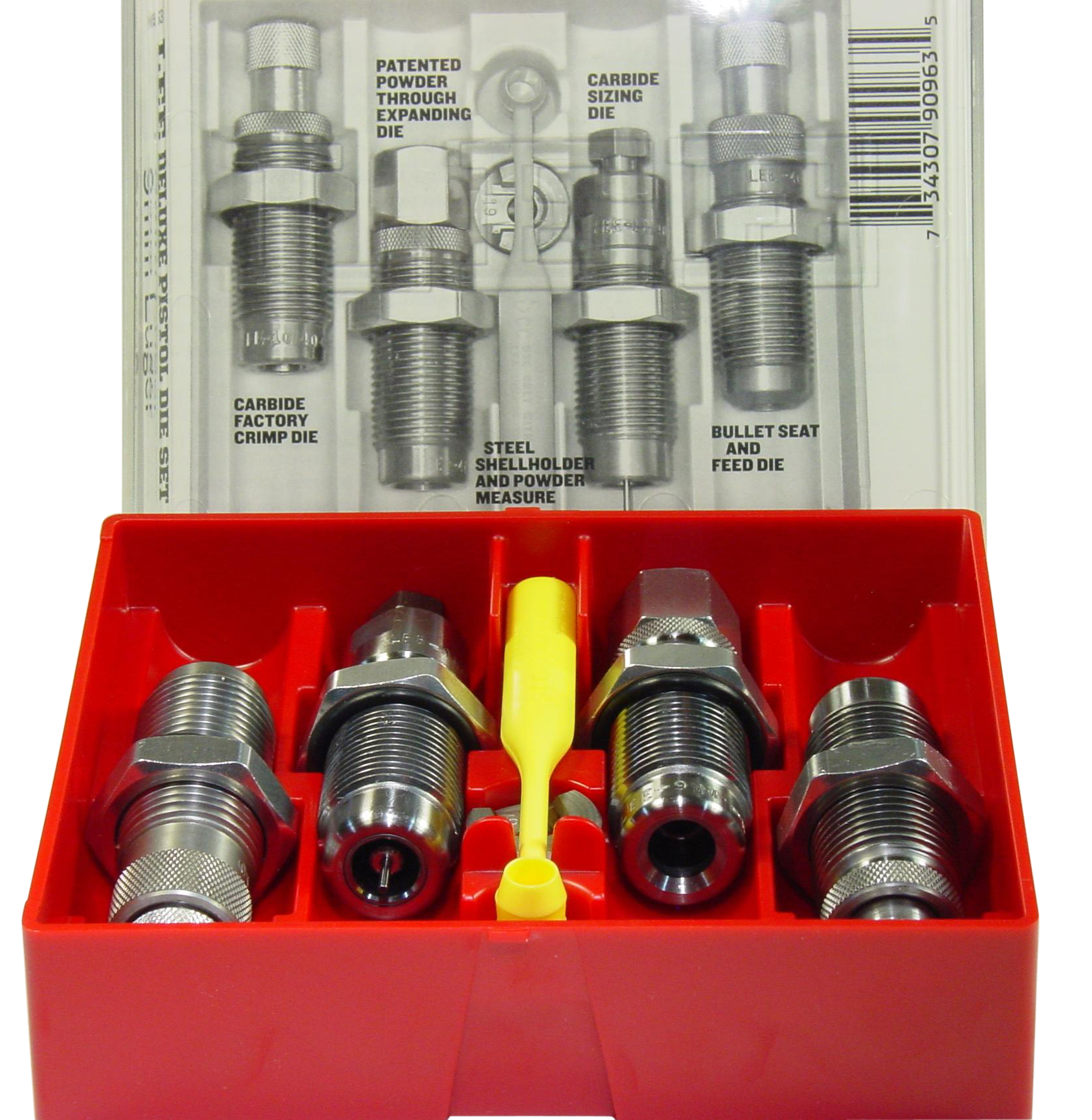 This deluxe pistol die set combines the most popular carbide three-die set with the lee carbide factory crimp die.By separating the seating and crimping operation, you will benefit by greatly simplified adjustment.The carbide factory crimp die post sizes your case, assuring that any round that passes through the die will chamber properly in your gun.