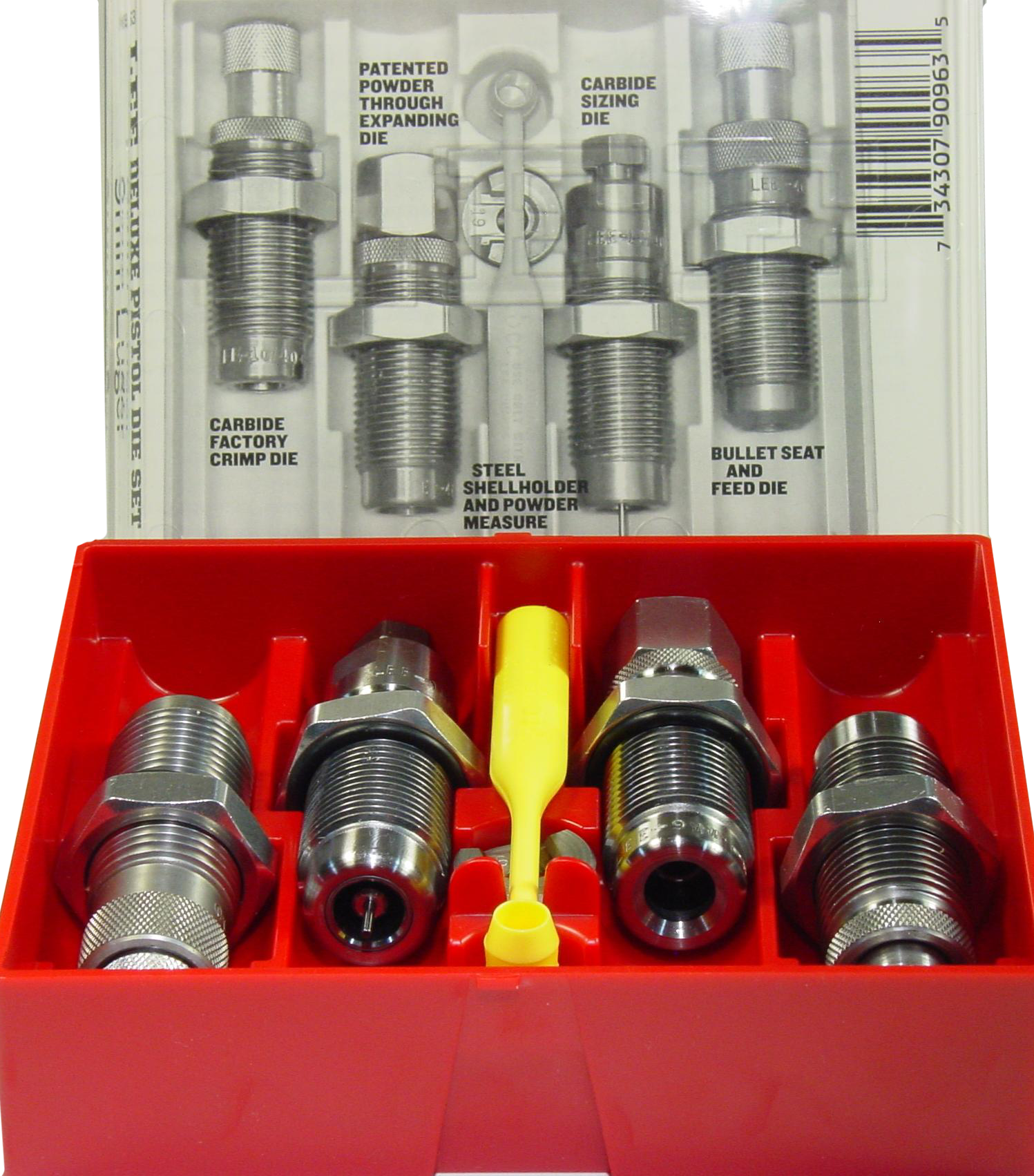 Lee's pistol 4-die set includes carbide full length sizing die, bullet seating die, powder thru expanding die, carbide factory crimp die, universal shell holder, powder dipper and instructions/load data.