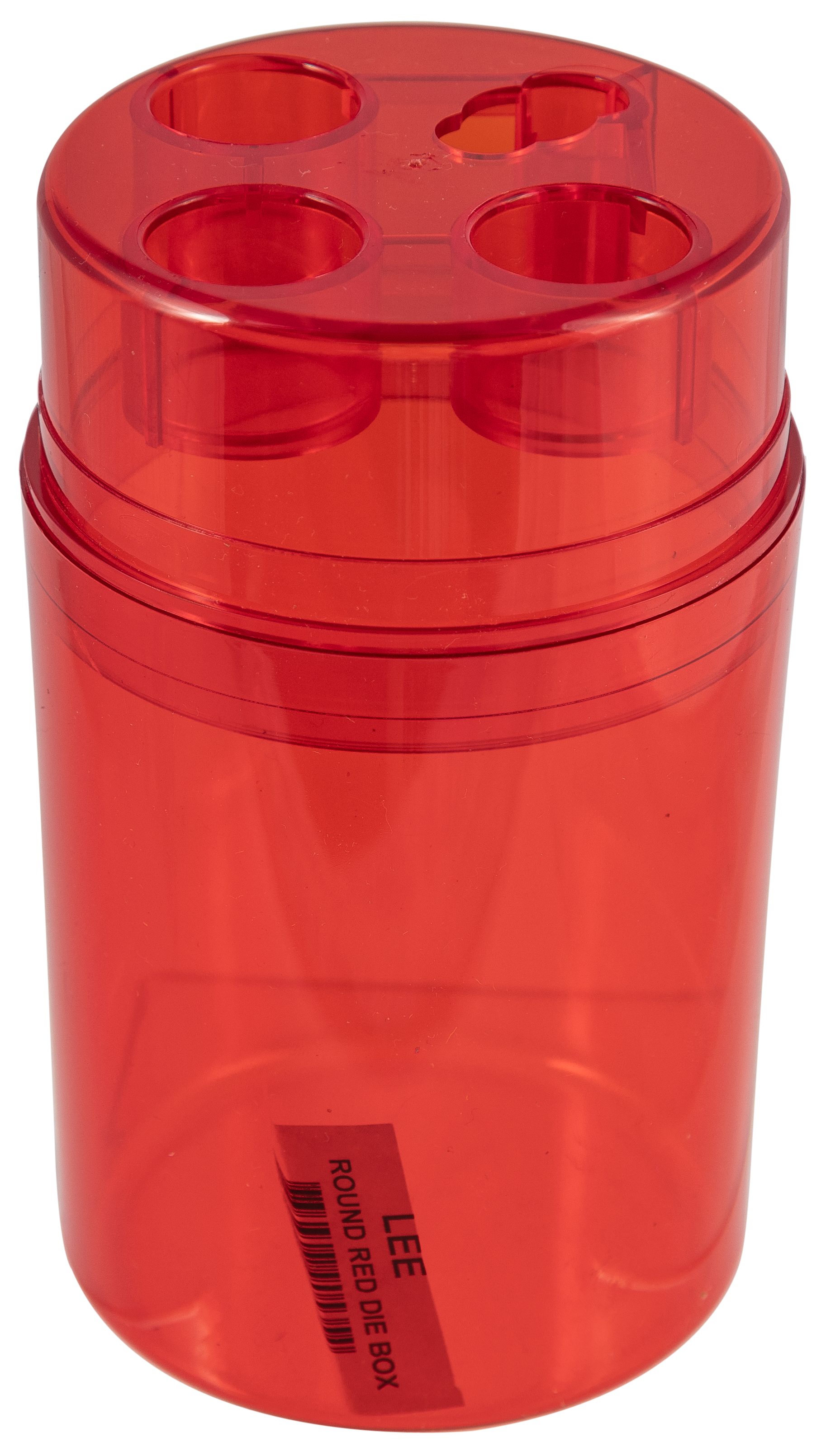 Lee red round die box, the perfect storage for your dies.Round box made of durable red plastic, holds three dies plus your universal shell holder and a dipper.Invert the bottom part of the box and store your 3-hole turret with your dies installed.Capacity: 3 DiesType: Round Die BoxCaliber: Multi-CaliberSize: 3 Die SetQuantity: 1Weight: 0.28 lbsFunction: Die StorageCompatible With: UniversalMaterial: PlasticIncludes: 4 Die Round Base/CoverFinish: RedMedia...View more