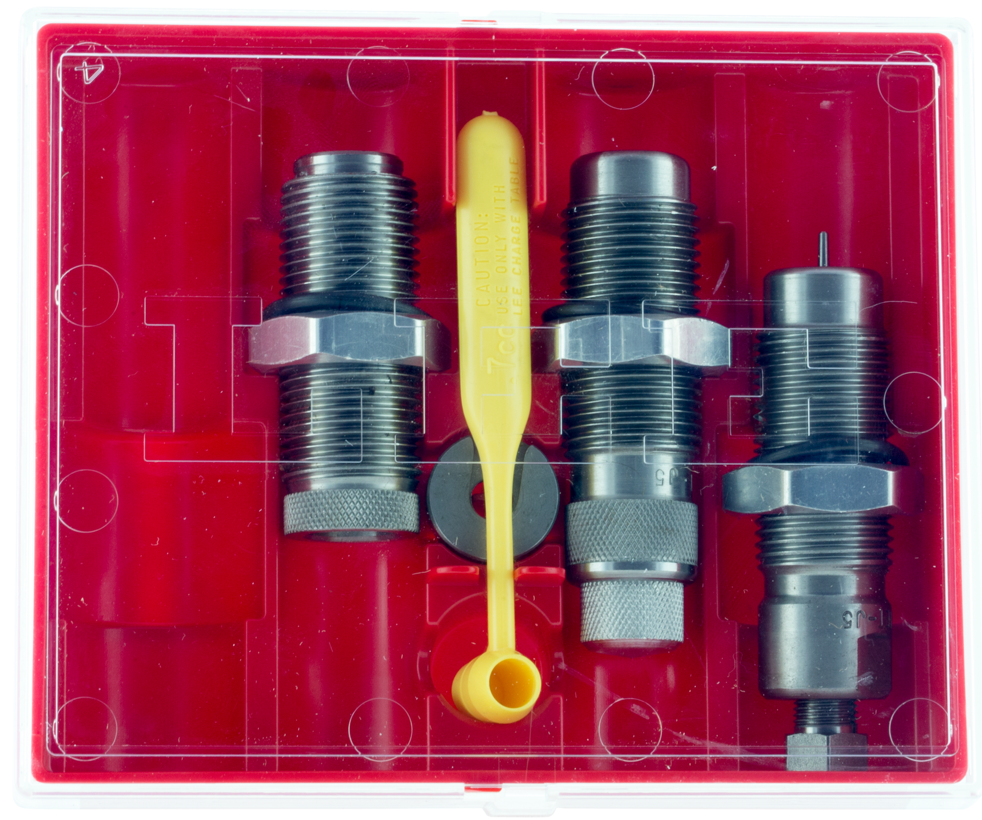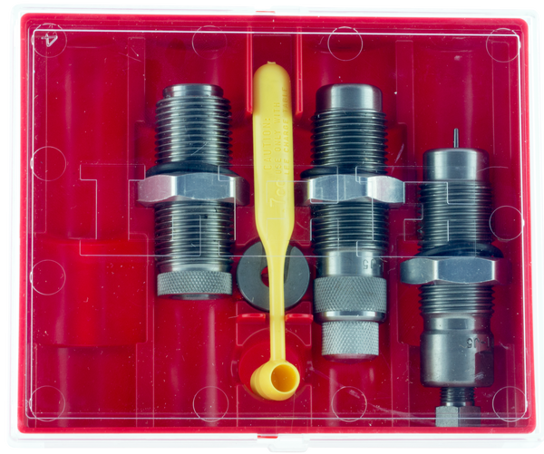 Lee's pacesetter 3-die set includes a full length sizing die, easy adjust dead length bullet seating die, factory crimp die, universal shell holder, powder dipper and instructions/load data.