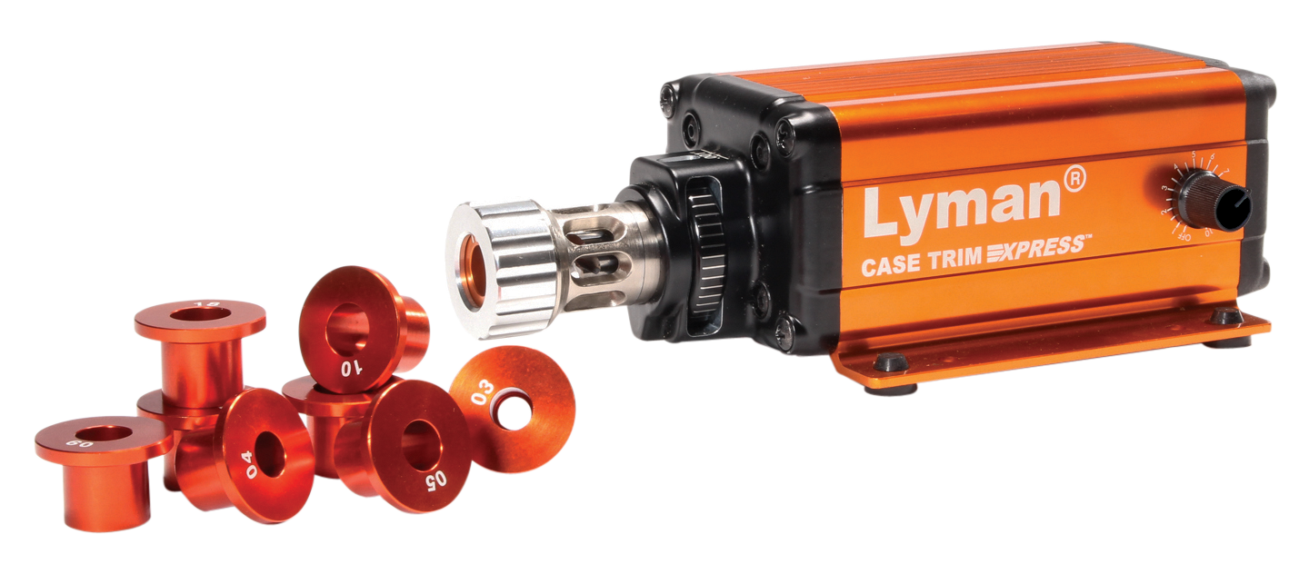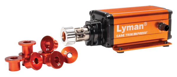 Lyman's case trim xpress gives rifle reloaders the speed and accuracy that they have been looking for when trimming cases.The unit has its own power source, and a strong variable speed motor, so there is no need to use power drills or pur- chase separate motors.By using bushings that contact on the shoulder of bottle neck type cases, the case trim xpress will quickly and cleanly trim your brass by simply pushing the case against the long lasting carbide cutter.It comes with a set of 10 bushings (in orange type below) designed to fit most popular bot- tleneck rifle cases.The bushings support and center the case with the cutter.No pilots are needed.The bushings are spring loaded to provide a smooth, effortless cut; and allow the user to trim approximately 15 cases per minute.In addition, the case trim xpress is equipped with an adjustment wheel, which allows case lengths to easily be "dialed in" to.001" increments.Plus the case trim xpress is made with a compact, low profile housing that doesn't eat up all of your bench space.