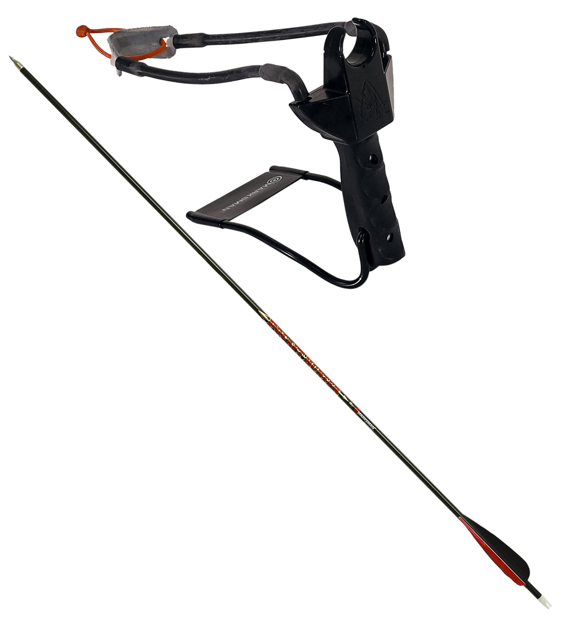 The pocket hunter was designed to provide a lightweight and efficient hunting unit that can be folded and easily carried in a backpack.It is capable of propelling the included arrow at 115 fps on beefed-up bands that have a pull weight of 42 lbs.The pocket and paracord combination allows you to easily nock the arrow and the patent pending adapter provides a distinct siting location that allows the hunter to hold the pocket hunter and accurately launch the arrow at the intended target.Includes a 31" carbon arrow.