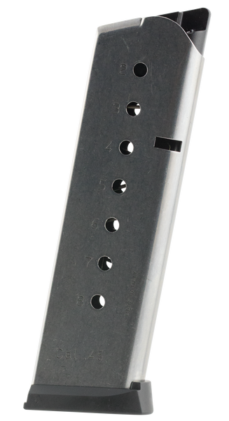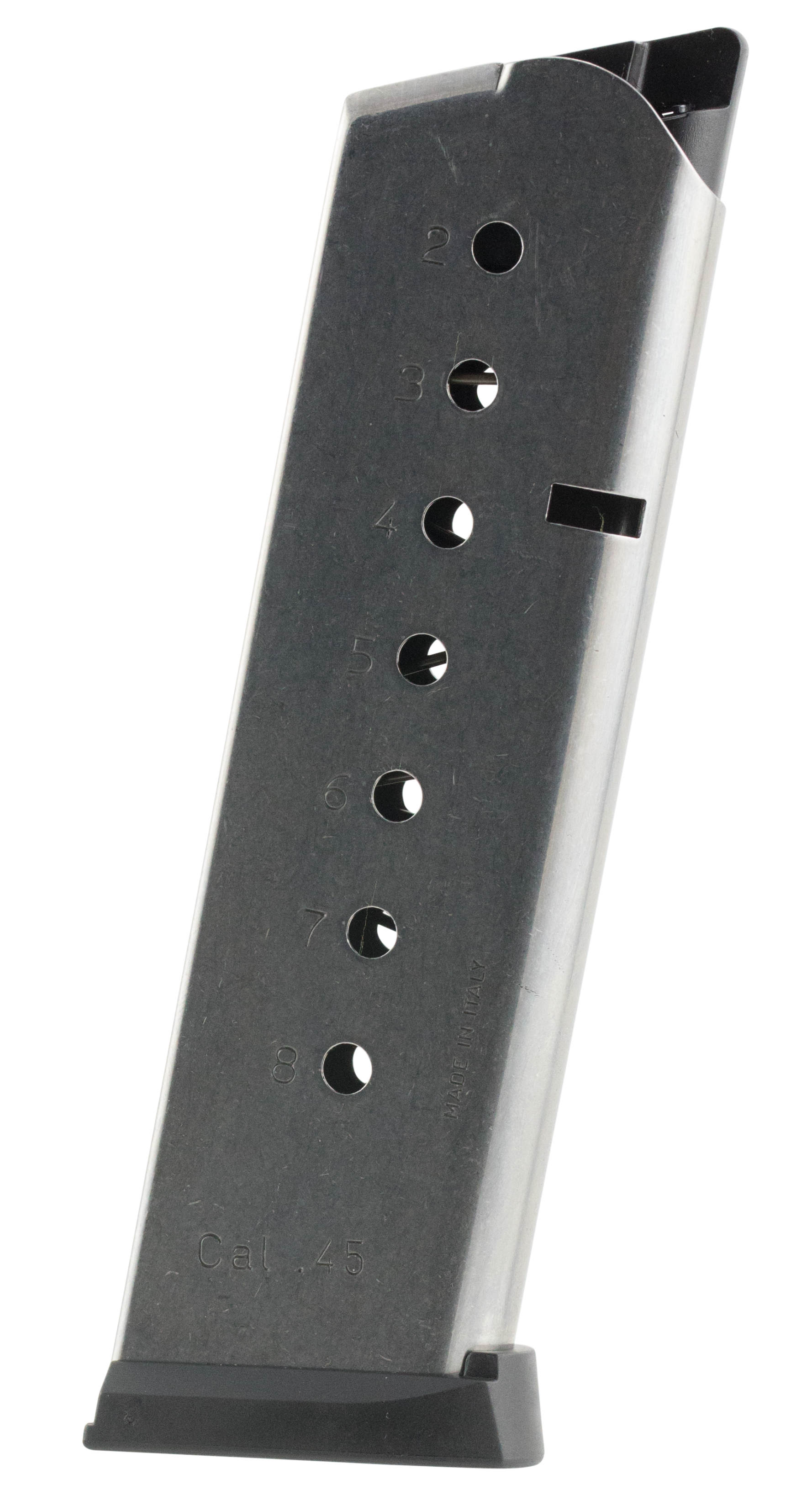 Mec-gar magazines are made in italy with the most sophisticated technologies and best materials.This mag features a high-impact polymer follower, heat treated carbon steel tube, and a high-impact polymer floor plate.Caliber: 45 ACPCapacity: 8rdFinish: StainlessModel: StandardMaterial: Stainless SteelType: DetachableModel Fit: 1911 GovernmentBrand Fit: ColtCapacity: 8View more