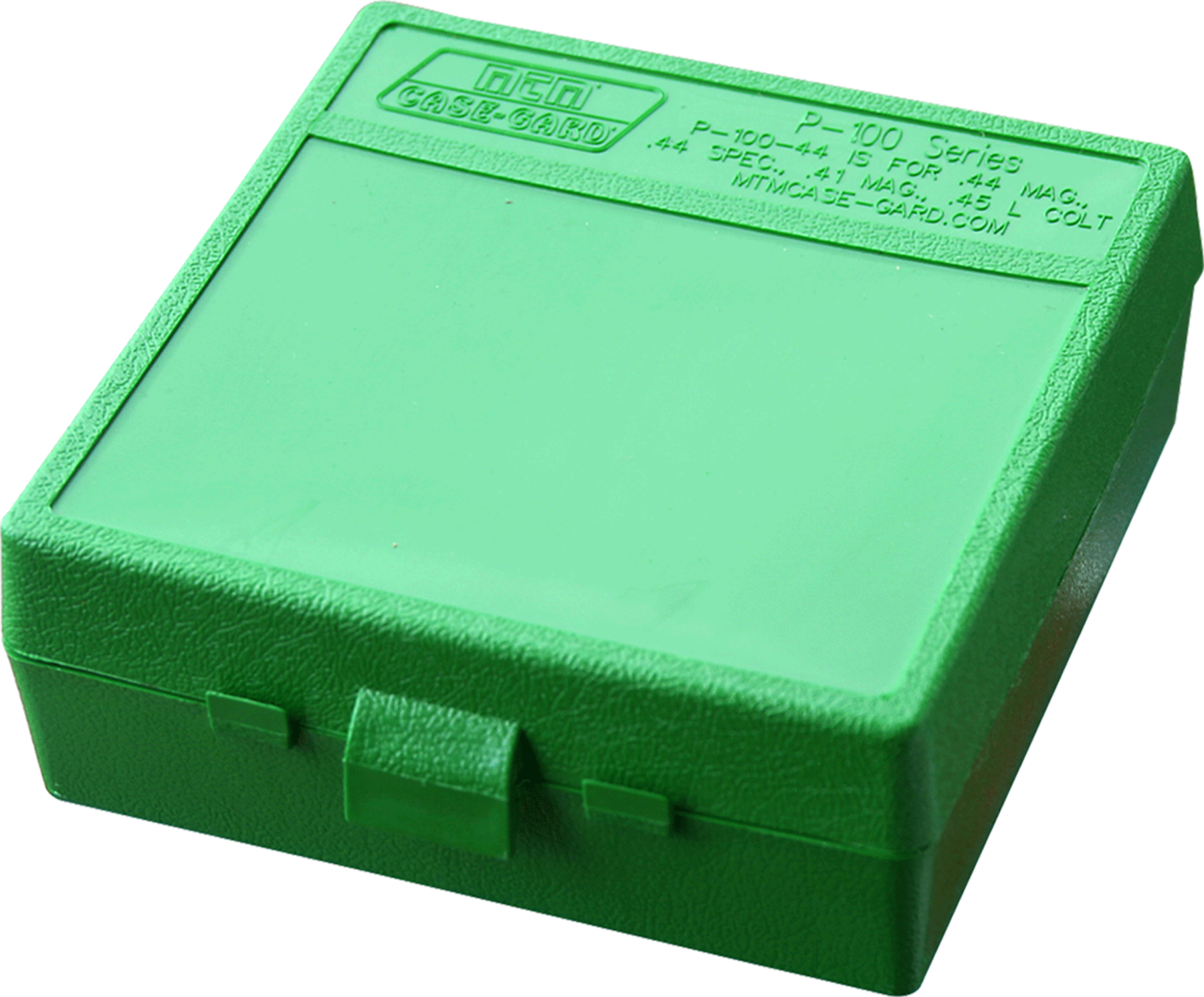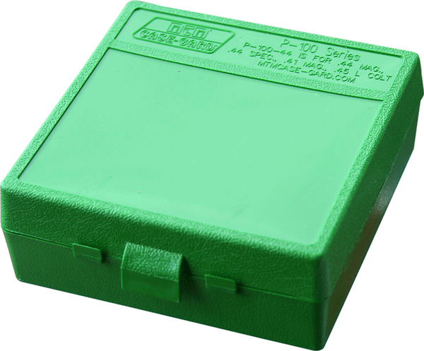 Mtm's case-gard p-100 series offers the perfect ammo carriers for the handgunner at the range.Each box holds 100 rounds, safeguarding from moisture and dust.It is ideal for storing reloads and is stackable.The textured box has an easy to grip, scuff-resistant surface, a snap-lok latch and durable, mechanical hinge.Each p-100 is supplied with a load label for recording custom loads.