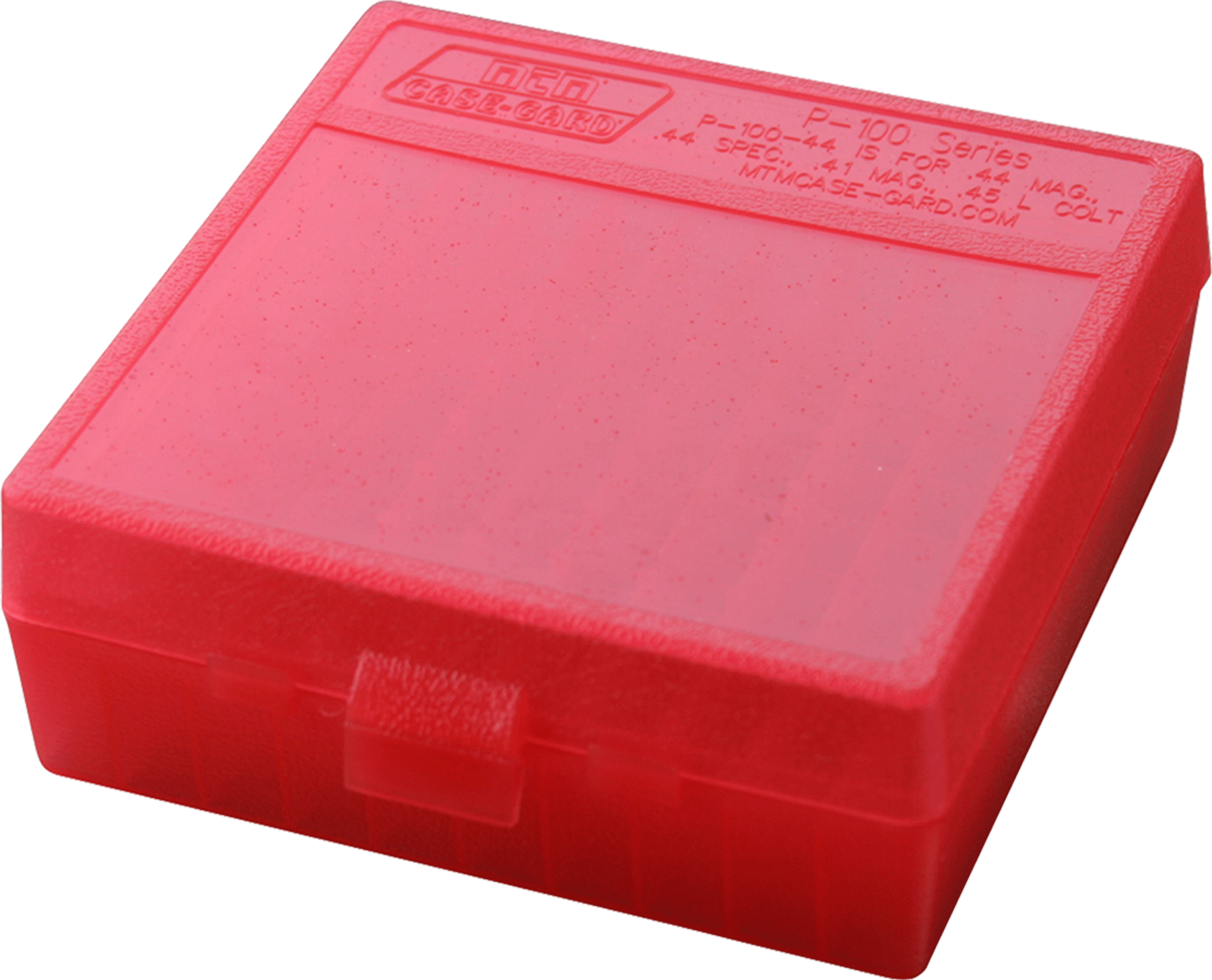 Mtm's case-gard p-100 series offers the perfect ammo carriers for the handgunner at the range.Each box holds 100 rounds, safeguarding from moisture and dust.It is ideal for storing reloads and is stackable.The textured box has an easy to grip, scuff-resistant surface, a snap-lok latch and durable, mechanical hinge.Each p-100 is supplied with a load label for recording custom loads.