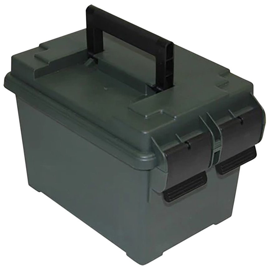 Mtm's 45 caliber ammo can is molded out of rugged polypropylene plastic, and this comfortably handled ammo can will hold up to some pretty harsh treatment.It is lighter in weight than a military surplus can.The 45 caliber ammo can is designed to hold a 500 round case of 45 acp or 4 boxes of 3 12 gauge shot shells and shooting glasses.Utilizing mtm's tongue and groove o-ring seal system for a water-resistant seal.A heavy-duty dual latching system makes for a better seal and less likely to open accidentally.Padlock tabs along with molded-in stacking ridges, make these solid containers the perfect solution to so many storage needs.