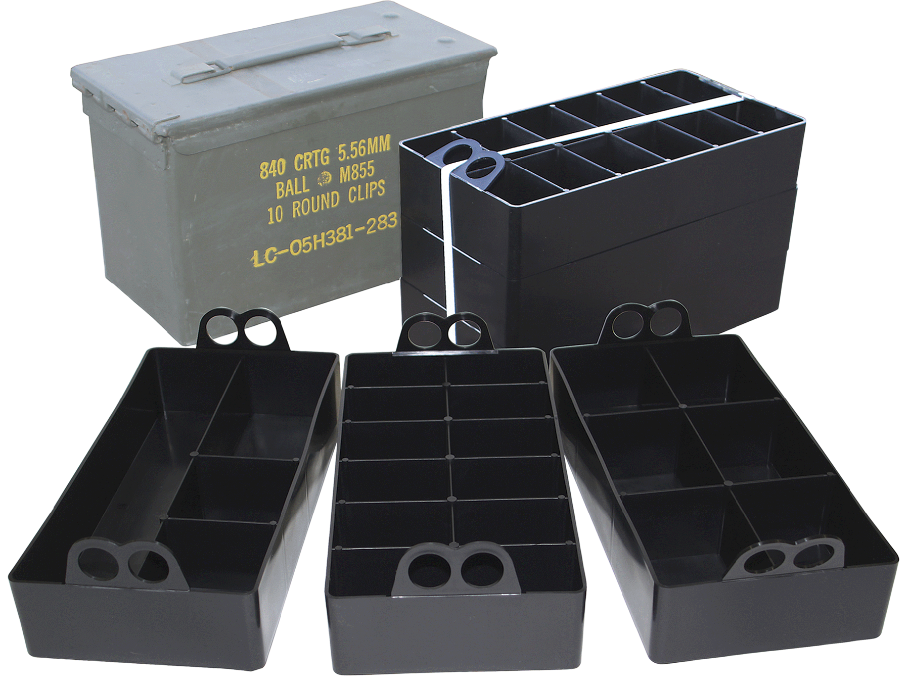 Mtm's ammo can organizer is a set of three plastic stacking trays that turn any 50-caliber ammo can into a 22-compartment organizer.Each tray has two handles for easy removal from an ammo can and the handles fold down for stacking.Constructed of durable polypropylene plastic, these trays resist oil and grease.