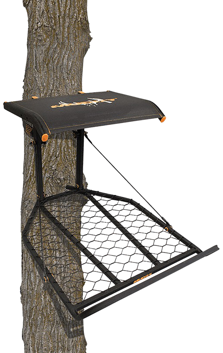 Muddy boss xl hang-on stand features a flex-tek seat that flips back for full platform use and a wide stance steel platform.Uses silent strap system so no metal to metal contact.Foot platform is 25" w x 34" d.Weight rating of 300 lbs.Includes full body fall arrest harness.