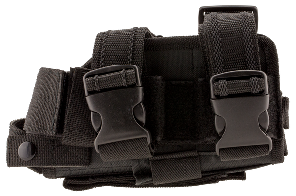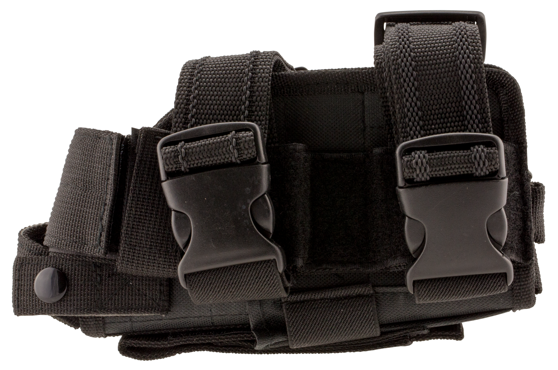 The drop leg holster is a composite design with tough pvc outer fabric with a stiff plastic insert between the fabric layers to hold the holsters shape and has a quilted sewing design.Featuring an adjustable thumb snap to secure your pistol in the holster, a single magazine pouch on the front edge of the holster, two adjustable slip resistant thigh straps with qr buckle, adjustable for height drop leg strap with quick connect buckle and dual belt loops with thumb snaps.The holster belt attachment has two nylon loops with thumb snaps for ease and quick attachment to your belt.Its drop leg strap is adjustable for drop via hook and loop fasteners.Fits most full size and compact semi-auto pistols.*note- holster will not fit a pistol with a flashlight or laser attached to the accessory rail.