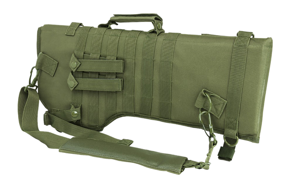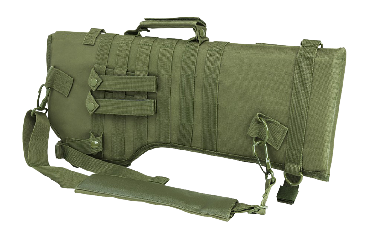 This tactical rifle scabbard is designed for the an easy, comfortable, and secure way of carrying a rifle/carbine over the shoulder or modular mounting onto molle compatible gear, with the rifle/carbine being readily accessible.This scabbard will fit most rifle/carbines with carry handle or scopes/optics attached to receiver rails.It also has a grommet for drainage.