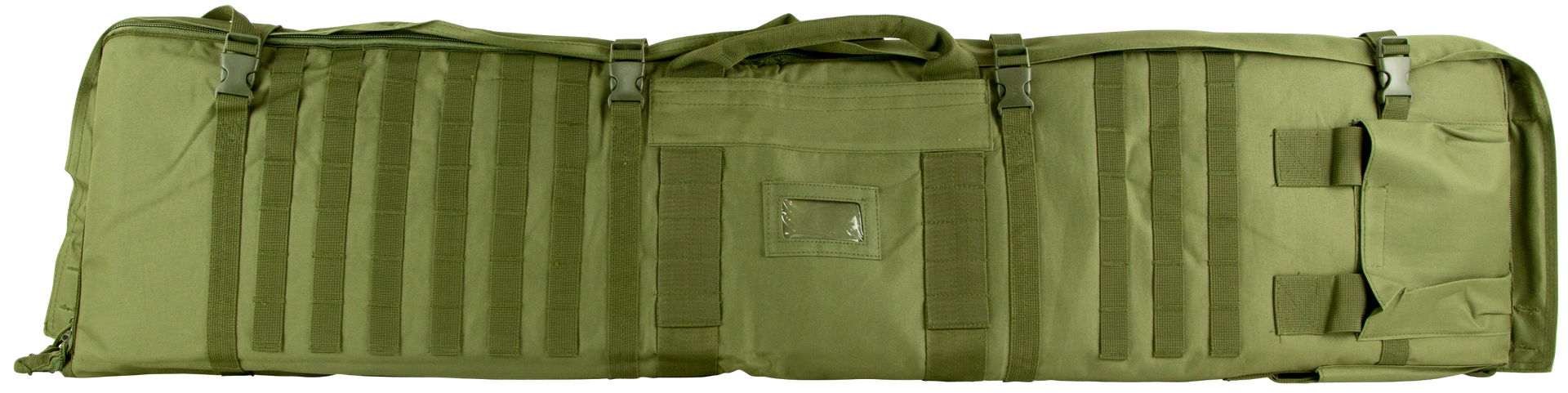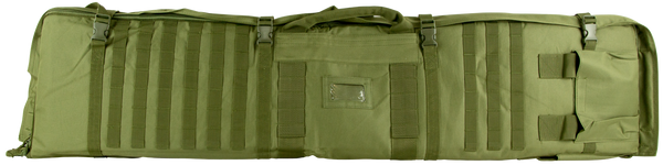 This rifle case/shooting mat has thick pads that protects you gun while transporting to the range.It also features heavy duty zippers, adjustable compression straps with quick connect plastic buckles, wrap around carry handle straps and molle webbing sewn to one side to attach other molle compatible gear to the case.Main compartment: 48" l x 11" h x 1.75" d.Rifle case unfolds into a 66" l x 35" w/shooters mat.