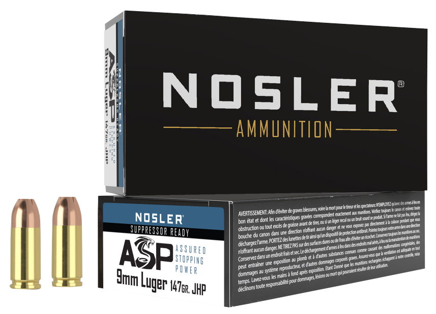 Nosler's assured stopping power (asp) ammunition line combines match-grade accuracy with a reliable, effective, hollow-point bullet.Evolving from the match grade ammunition line, asp ammunition is loaded with the same quality and attention to detail that match grade users have come to expect, with the addition of an expanding hollow-point bullet designed specifically for duty and defensive use.Loaded in nosler head-stamped brass, and utilizing quality components throughout, the asp ammunition can be relied upon to perform in a wide variety of applications and ranges.Equally, at home on duty or in a defensive role, law enforcement professionals and civilians alike can rest assured that asp ammunition will perform when needed.
