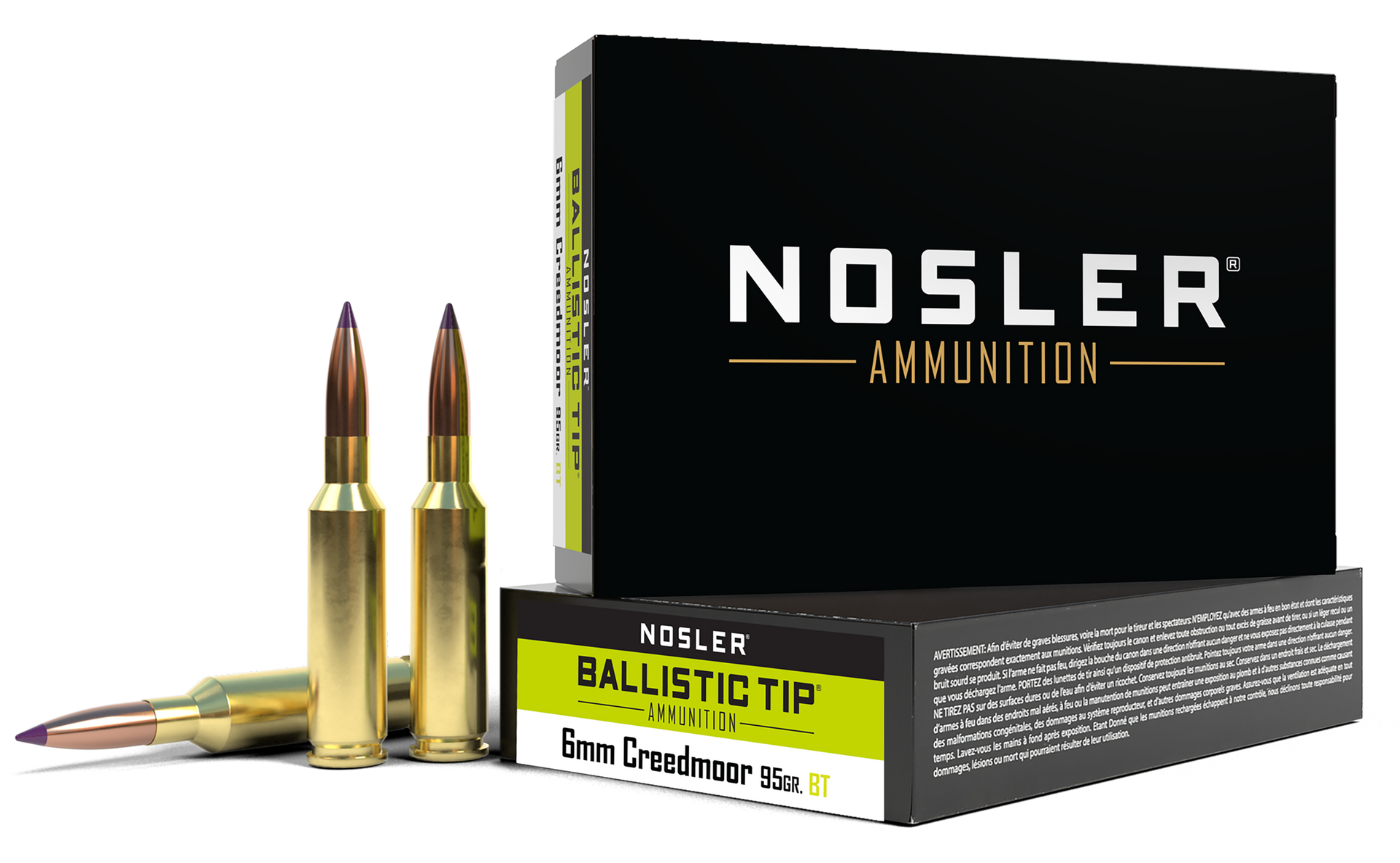 Nosler ballistic tip ammunition is loaded up front with the accurate and reliable, nosler ballistic tip bullet.Every bullet weight and muzzle velocity is optimized for maximum effectiveness on deer, antelope, and hogs.Caliber: 6mm CreedmoorBullet Type: Spitzer Ballistic TipBullet Weight: 95 grMuzzle Energy: 2027 ft lbsMuzzle Velocity: 3100 fpsRounds Per Box: 20Boxes Per Case: 10Application: HuntingCasing Material: BrassHazair: YesView more
