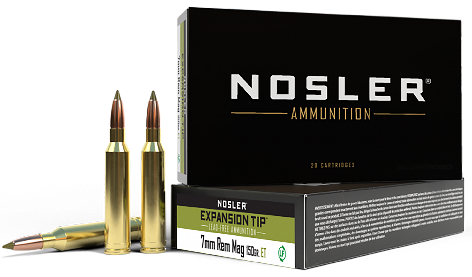 Nosler e-tip, lead-free, ammunition is loaded up front with the high-performance, lead-free, e-tip hunting bullet.The e-tip bullet combines uniform expansion with 95%+ weight retention for superior penetration and excellent terminal performance on all types of big game.