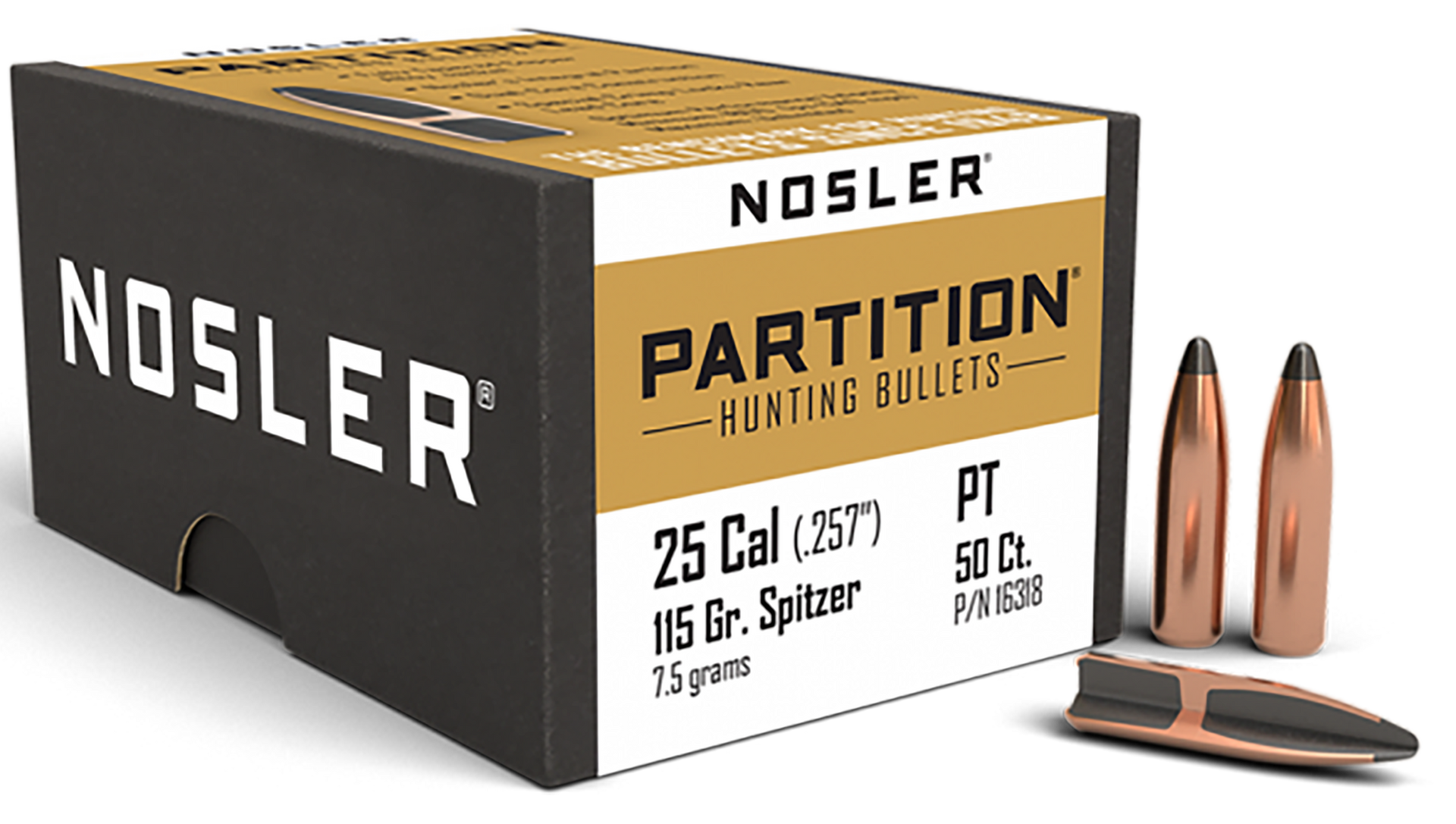 Every partition bullet in the nosler line is engineered with an optimum length, weight and ogive design for maximum in-flight and terminal performance.The fully tapered copper-alloy jacket ruptures instantly at the thin mouth, yet the gradual thickening along the bullet's axis controls expansion and curls the jacket uniformly outward at high and low velocities.Nosler's integral partition supports the expanded mushroom and retains the rear lead alloy core.Enclosed rear core retains more than half the original bullet weight for deep penetration.Special crimp locks add strength to resist deformation under the pressure of heavy magnums.