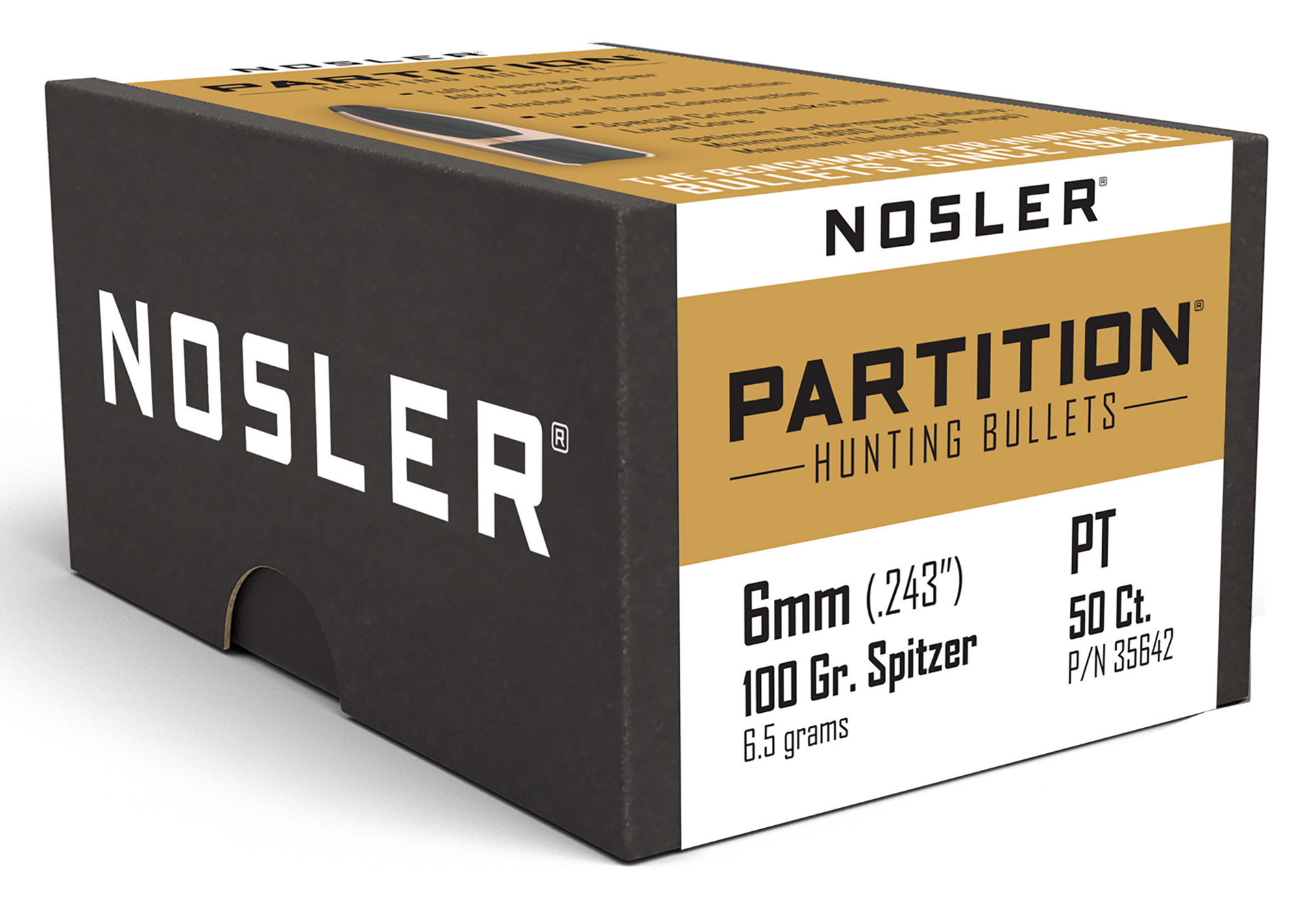 Every partition bullet in the nosler line is engineered with an optimum length, weight and ogive design for maximum in-flight and terminal performance.The fully tapered copper-alloy jacket ruptures instantly at the thin mouth, yet the gradual thickening along the bullet's axis controls expansion and curls the jacket uniformly outward at high and low velocities.Nosler's integral partition supports the expanded mushroom and retains the rear lead alloy core.Enclosed rear core retains more than half the original bullet weight for deep penetration.Special crimp locks add strength to resist deformation under the pressure of heavy magnums.
