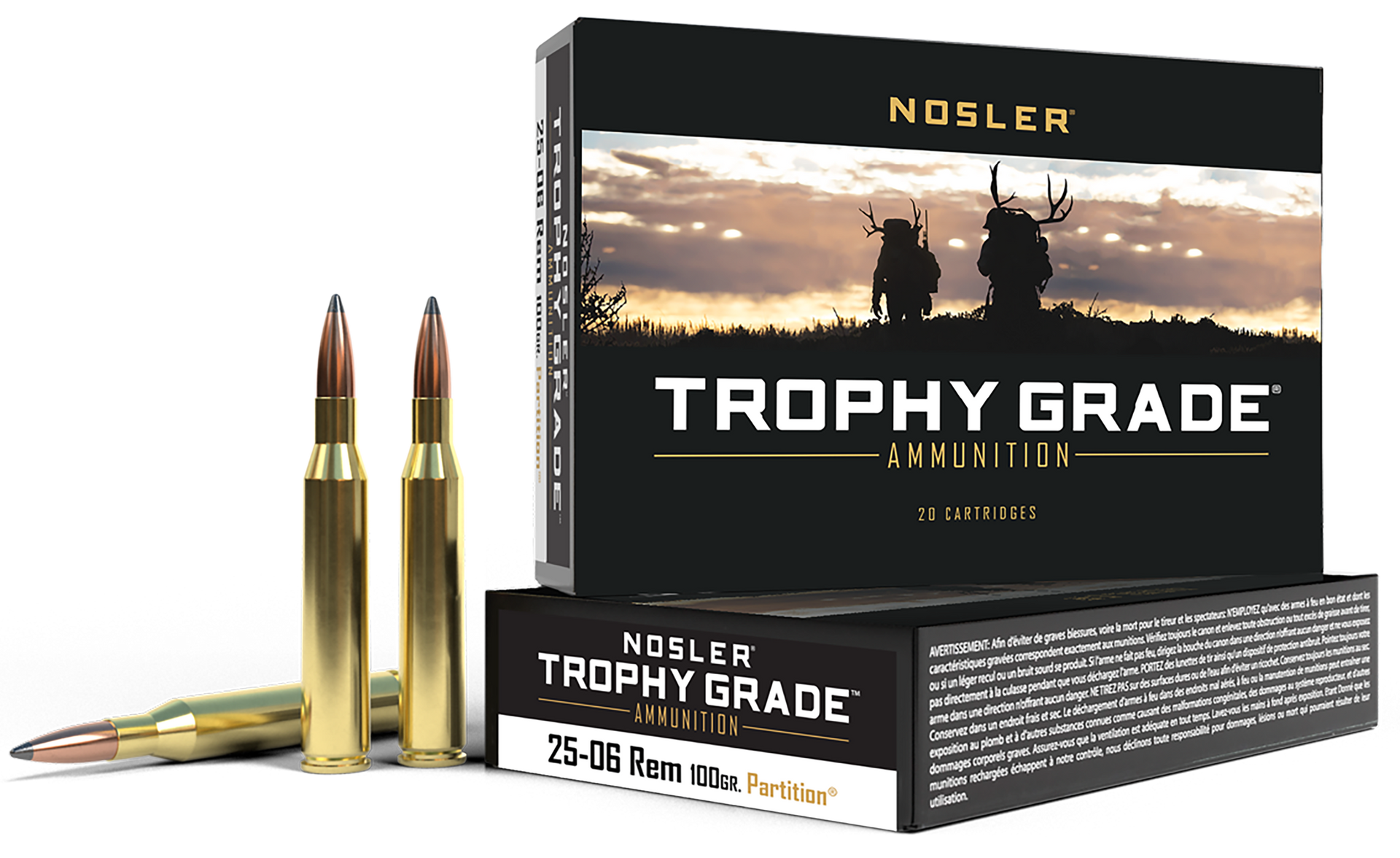 Manufactured to nosler's strict quality standards, trophy grade ammunition uses nosler custom brass and nosler bullets to attain optimum performance, no matter where your hunting trip takes you.Whether you want your ammunition loaded with accubond, partition ballistic tip, or e-tip, nosler trophy grade ammunition will have the right load for the right game.Caliber: 25-06 RemBullet Type: Nosler Spitzer PartitionBullet Weight: 100 grMuzzle Energy: 2417 ft...View more