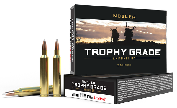 Manufactured to nosler's strict quality standards, trophy grade ammunition uses nosler custom brass and nosler bullets to attain optimum performance, no matter where your hunting trip takes you.Whether you want your ammunition loaded with accubond, partition ballistic tip, or e-tip, nosler trophy grade ammunition will have the right load for the right game.Caliber: 7mm RUMBullet Type: Nosler Spitzer PartitionBullet Weight: 160 grMuzzle Energy: 3694 ft...View more
