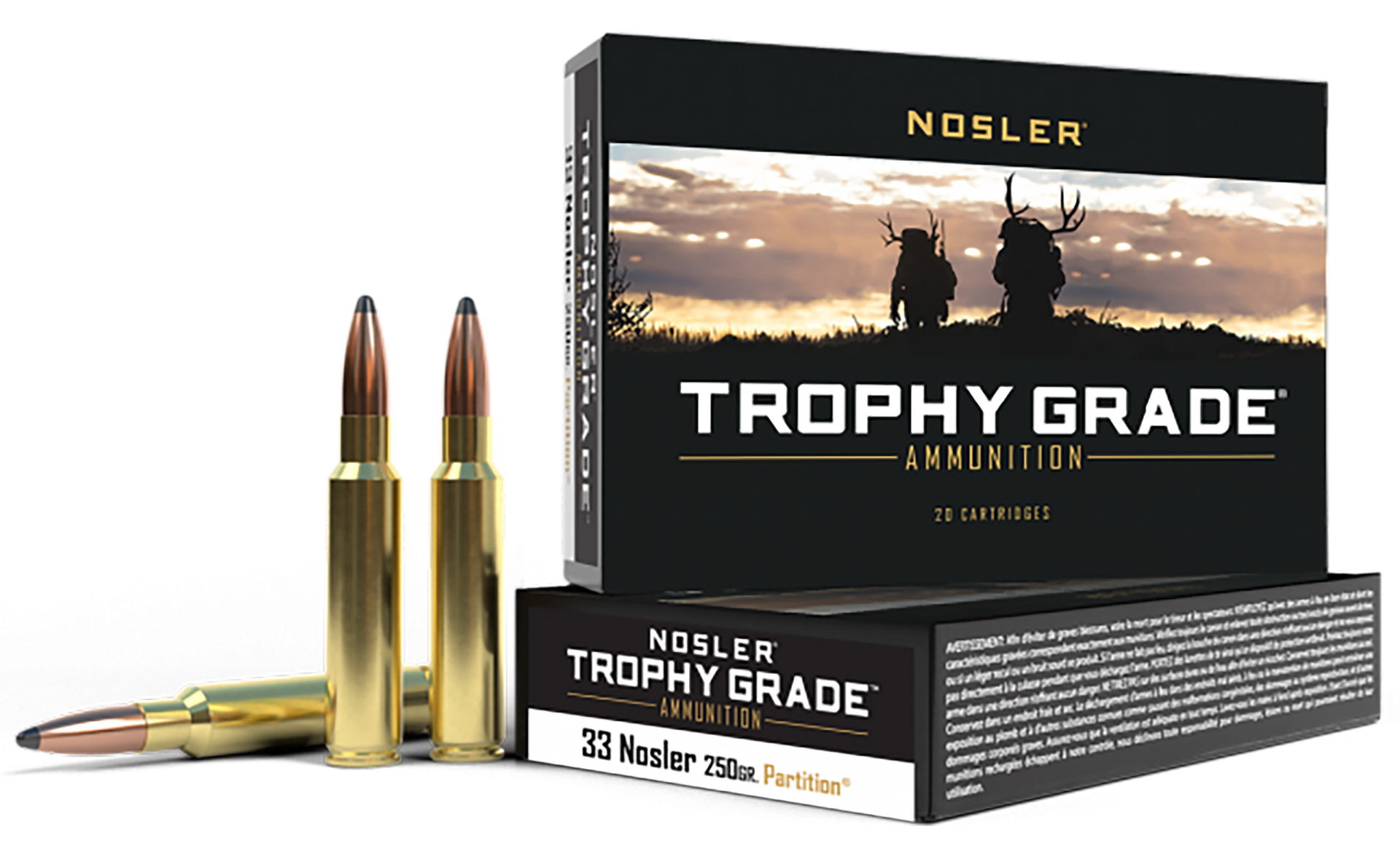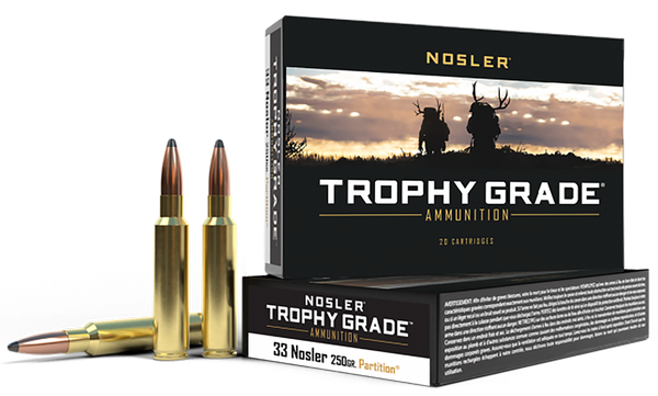 Manufactured to nosler's strict quality standards, trophy grade ammunition uses nosler custom brass and nosler bullets to attain optimum performance, no matter where your hunting trip takes you.Whether you want your ammunition loaded with accubond, partition ballistic tip, or e-tip, nosler trophy grade ammunition will have the right load for the right game.Caliber: 33 NoslerBullet Type: Nosler Spitzer PartitionBullet Weight: 250 grMuzzle Energy: 4197 ft...View more