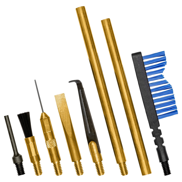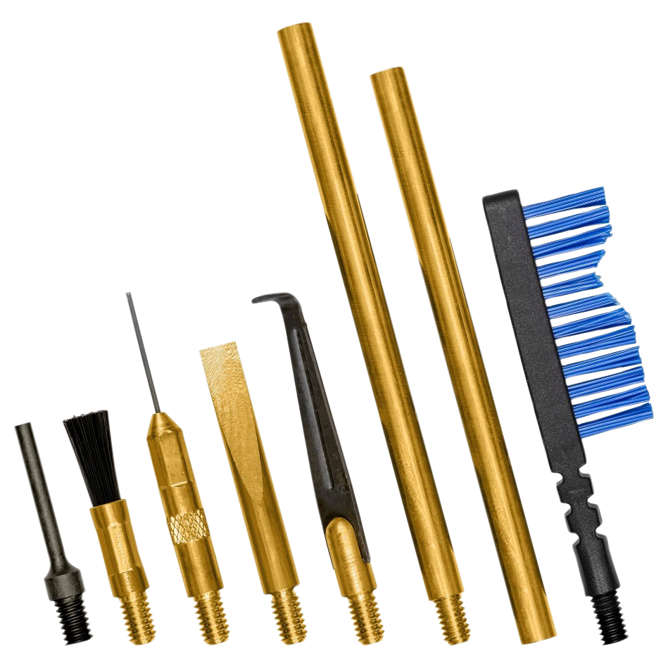 The brass scraper maintenance tool set contains the tools to clean some of the most critical parts of your firearm.Included in this set is a scraper, locking lug scraper, straight pick, pin punch, nylon end brush, a compact receiver brush and two rod handles.These tools will not scratch the firearm and with them you can now thoroughly clean areas such as the locking lugs, the slides, bolt face, rails and any other hard to reach places.