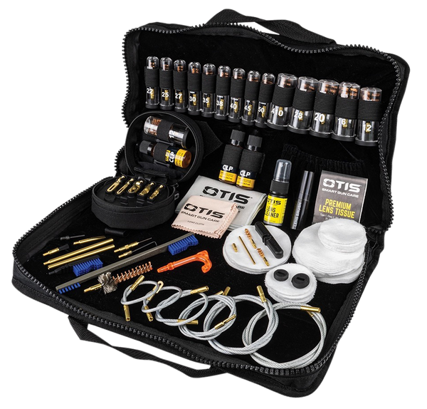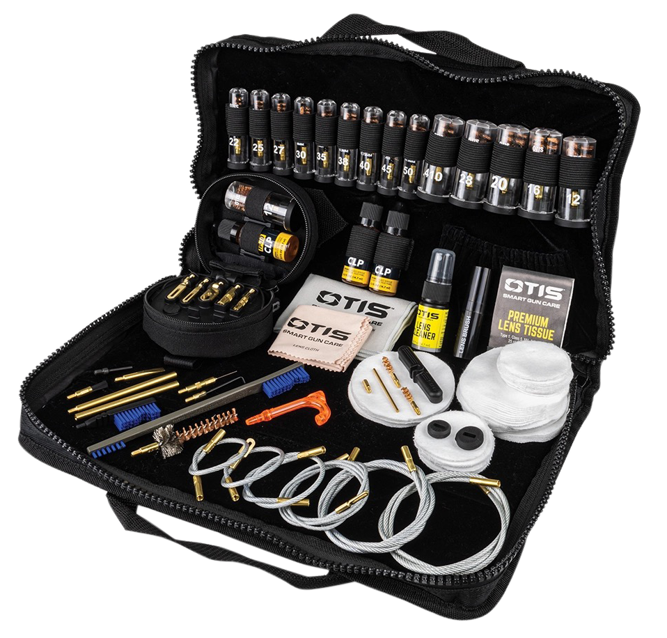 The otis elite delivers top notch performance and durability to the avid gun user by ensuring a proper breech-to-muzzle cleaning experience.This universal gun cleaning kit comes complete with over 60 components for all rifles, pistols, shotguns and inline muzzleloaders, including a full tactical cleaning kit all contained in a lightweight, portable case.The kit includes: 100% cotton 2" & 3" patches; 3 slotted tips; 2 patch savers; 16 firearm specific bronze bore brushes with size marked on brush stem (.17,.22 limited breech,.22/.223,.243-.260,.270/7mm,.30-06/.300/30-30/.308,.338-.35,.357-38cal/9mm,.40/10mm,.44/.45,.50cal,.410ga, 28ga, 20ga, 16ga, 12/10ga); 8", 12" and 36" aircraft grade memory-flex cables and thread connector; small & large obstruction removers which double as a t-handle base for included t-handle; small t-handle & stud included;.223cal/5.56mm chamber brush, pin punch, end brush, straight pick, locking lug scraper, scraper, short ap brush, double end ap brush and male & female rod; lens tissue, lens spray, lens brush and lens cloth; microfiber gun cloth; chamber flag; (2) 0.5 fl.Oz.Bio-clp.Made in the usa.</p>