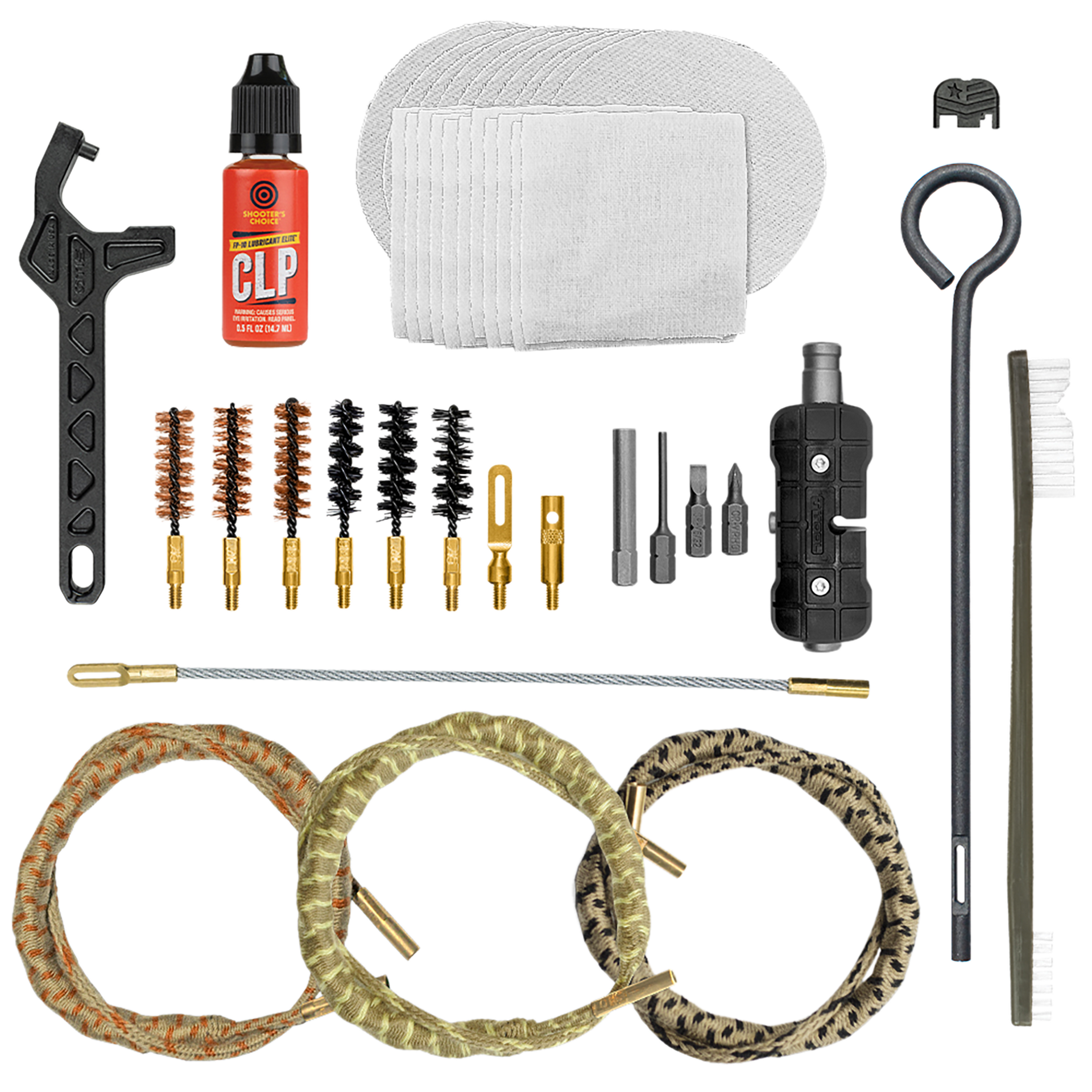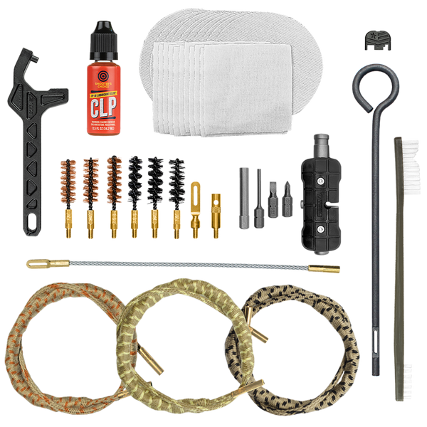 This comprehensive cleaning kit is a must-have for glock owners.Contains all the tools to clean, maintain and service 9mm,.40 cal and.45 cal glock pistols.Clean from breech-to-muzzle with the included memory-flex cable and components, utilize the ripcord in the field for a quick, one-pass clean or punch a patch with the pistol loop rod.This kit takes maintenance to the next level with an 8-in-1 pistol t-tool for resetting pins, pushing take down pins, front site adjustment and more.Ensure a complete clean of even magazines with the included magazine plate removal tool.Customize glocks with a patriotic slide back plate.