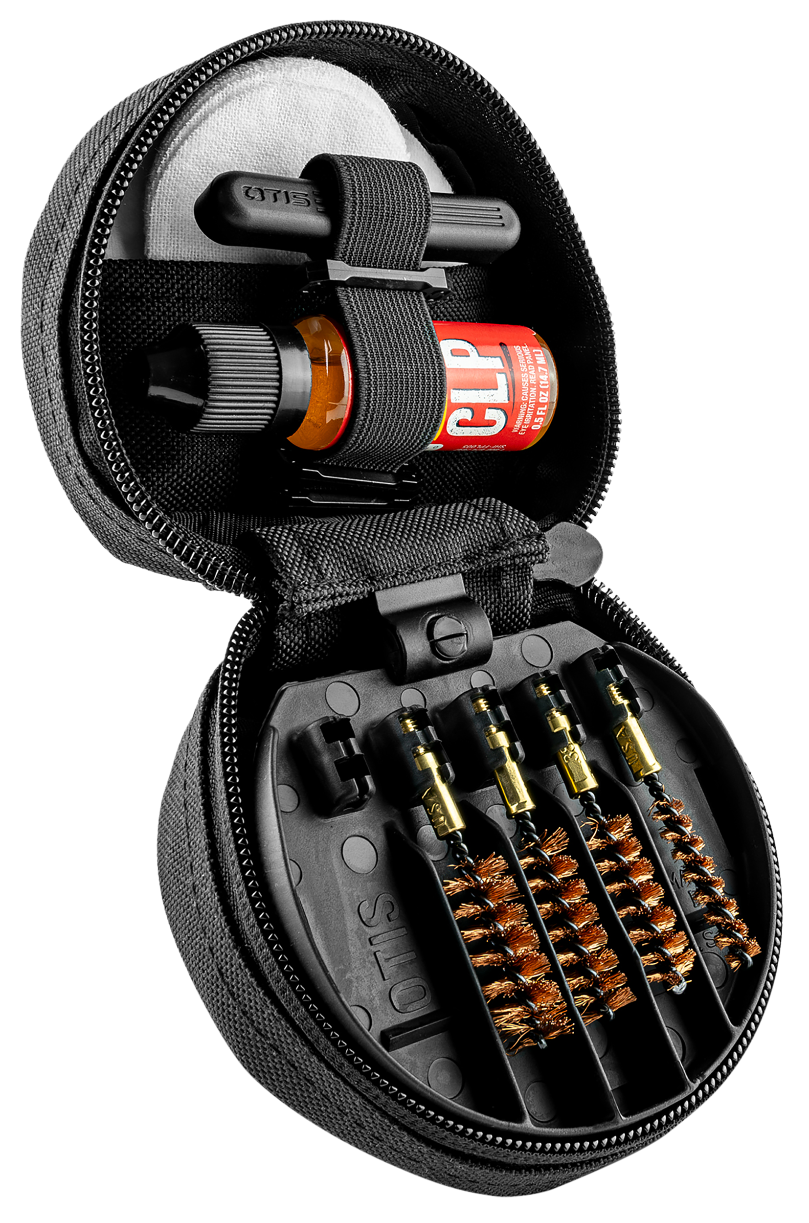 Otis' pistol cleaning system is portable and effective.It comes packaged in a 4"x4"x2 1/4" lightweight soft pack with a belt loop for convenient carrying.Included is 8", 12" and 20" memory-flex cables for effective and correct breech-to-muzzle cleaning, two caliber-specific bronze bore brushes for removing copper and lead deposits, otis' bio clp for lubrication and protection, a t-handle, and an obstruction removal tools for jammed casings and other blockages.This system comes with.38 and.45 cal brushes and cleaning patches for.22 -.45 cal.