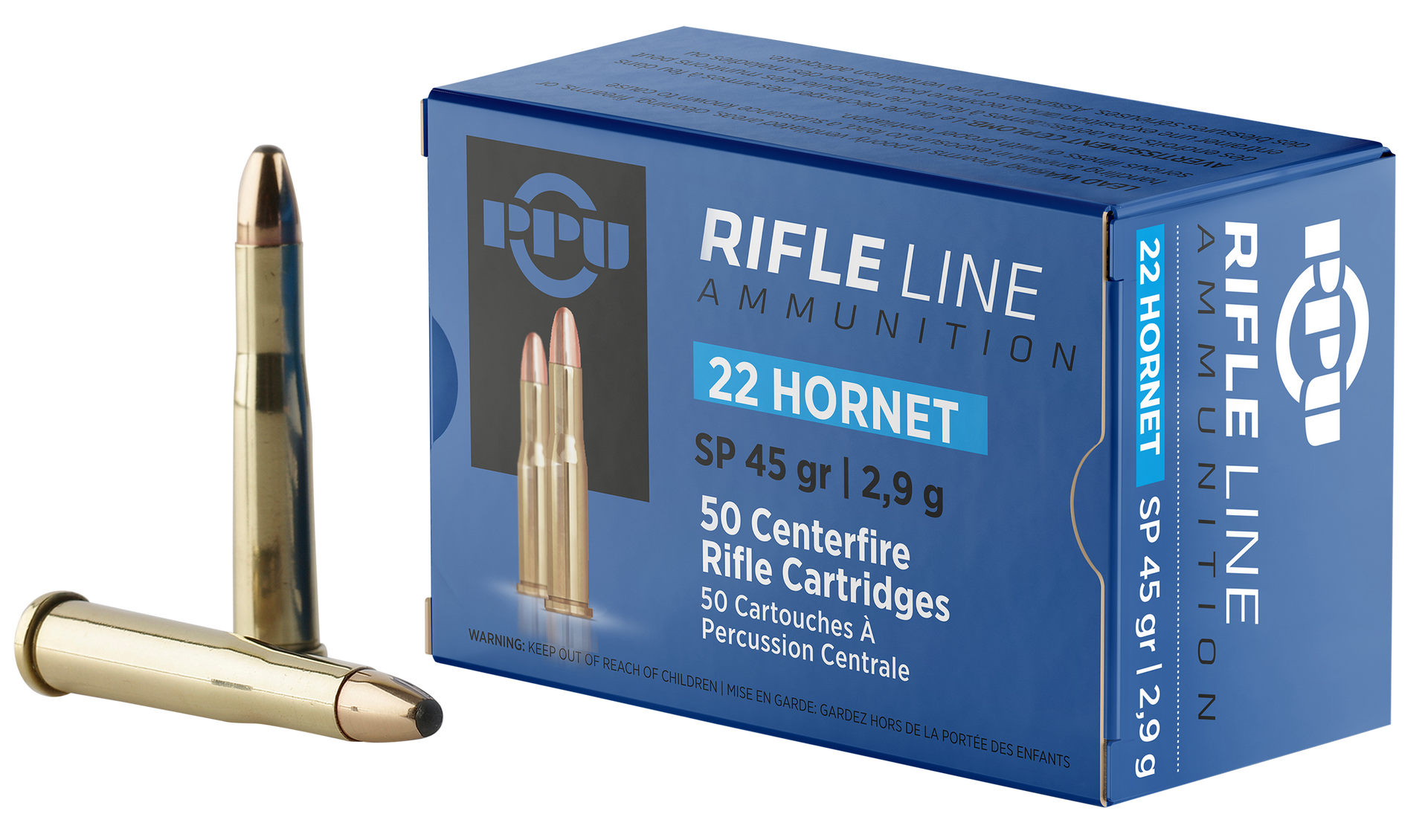 Ppu's standard line of rifle ammunition is designed especially for big game hunting.Only the best quality components are used during production to ensure that these cartridges are accurate, dependable, and effective.Caliber: 22 HornetBullet Type: Soft PointBullet Weight: 45 grMuzzle Energy: 590 ft lbsMuzzle Velocity: 2430 fpsRounds Per Box: 50Boxes Per Case: 20Application: HuntingCasing Material: BrassHazair: YesView more