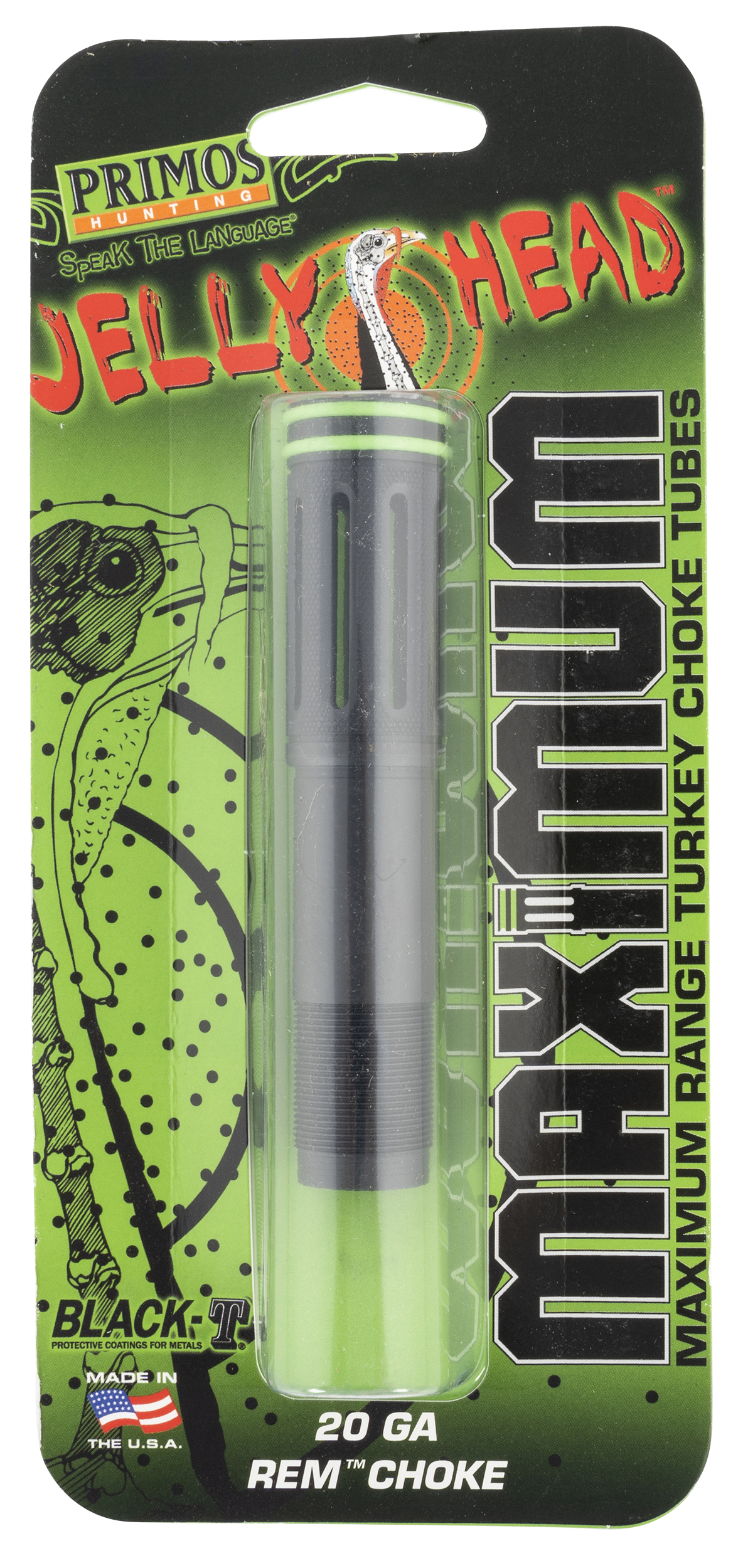 The jelly head maximum utilizes an extended taper and fluted ports to tighten patterns up to 20% and reduce recoil, allowing hunters to stop gobblers in their tracks at even longer ranges.Primos utilizes proprietary black-t coating, the same protective barrier utilized by the military's special forces to prevent rust and corrosion on weapons in the harshest environments, like turkey hunting.Designed to shoot hevi-shot, copperplated lead or regular lead.90% pattern density at 40 yards.