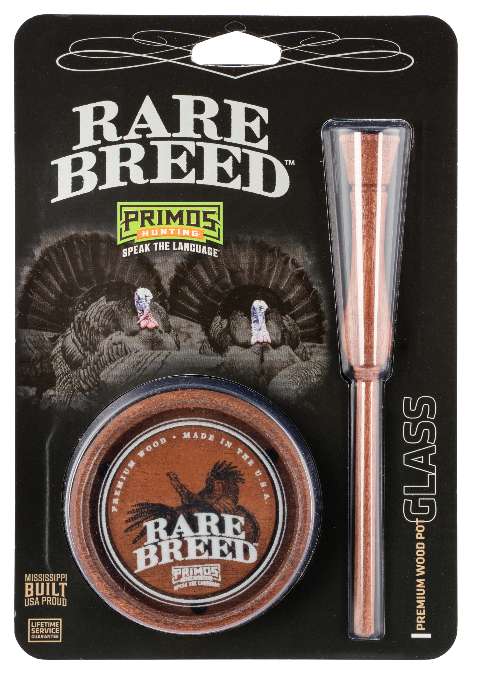 Primos rare breed turkey call features a comfortable rounded cup which fits great in your hand while working a bird.Outer edges of the call produce higher yelps, cuts, and clucks while lower and deeper tones can be made towards the middle.Play loud or soft, whichever fits your needs.Solid one-piece striker and abrasive pads included.