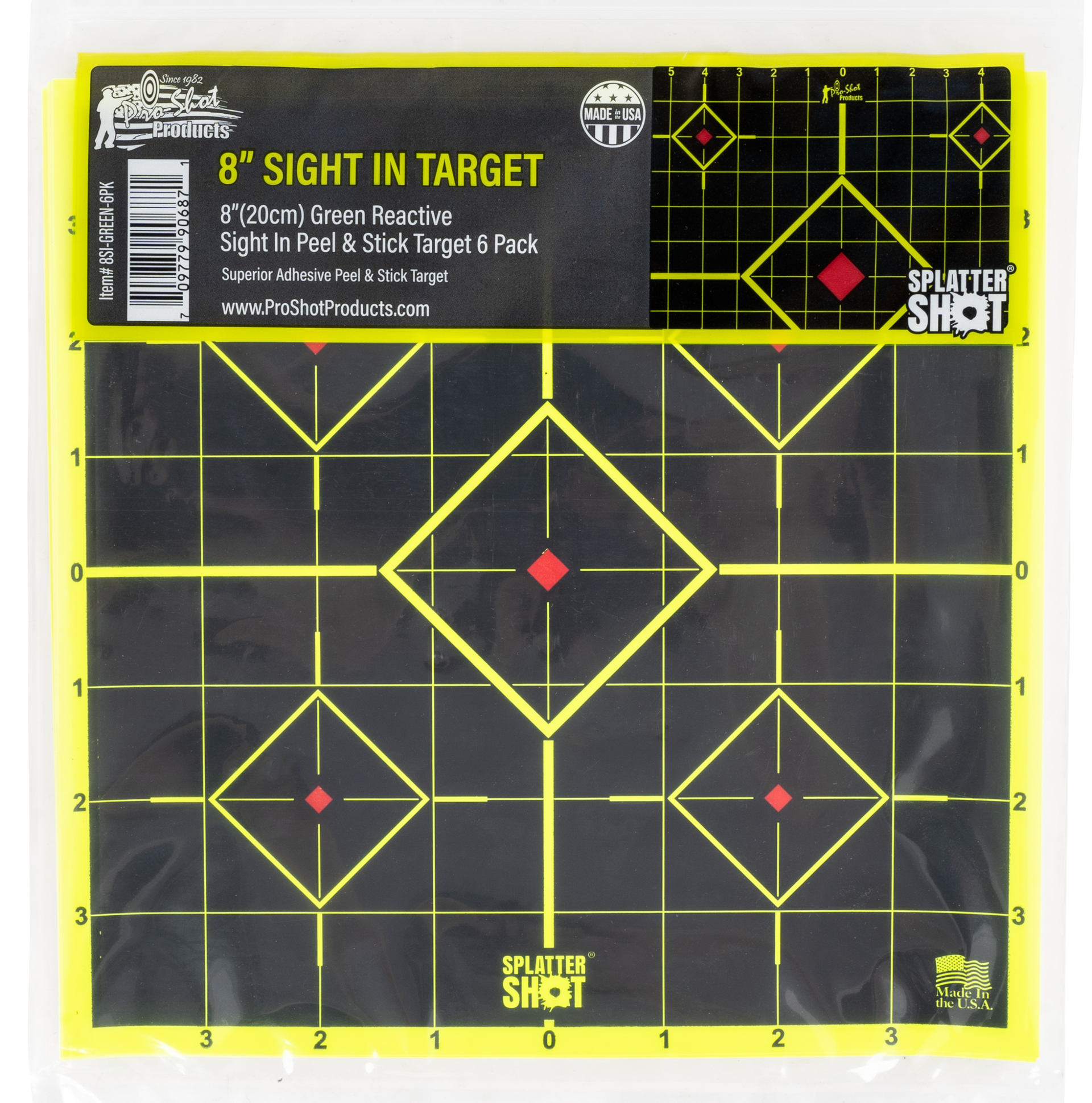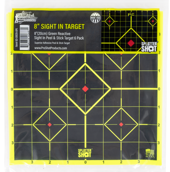 Pro-shot's splattershot peel and stick sight-in targets main center target is used for sighting-in purposes, the four smaller targets can be used for confirmation of sight-in groups or testing various ballistic loads.Bullet holes are revealed with bright green rings.1" numbered grid lines for scope adjustments.Enhancement Color: Bright GreenQuantity: 6 PackMaterial: PaperIllustration: 5-DiamondImpact Enhancement: YesMount Type: Self-AdhesiveTarget Color: Black/GreenView more