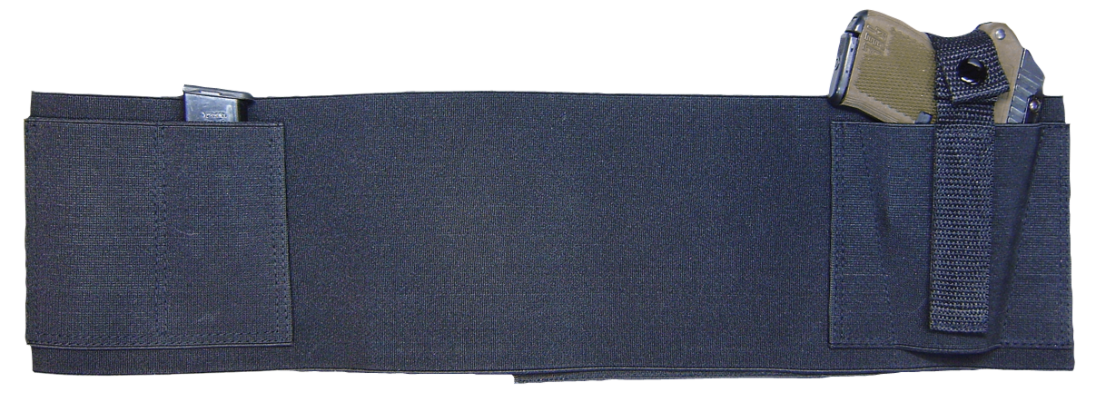 The concealed carry belly band is a waist wrap with a holster on one side and extra magazine pockets on the other.It is made of heavy-duty elastic with a secure, velcro closure.