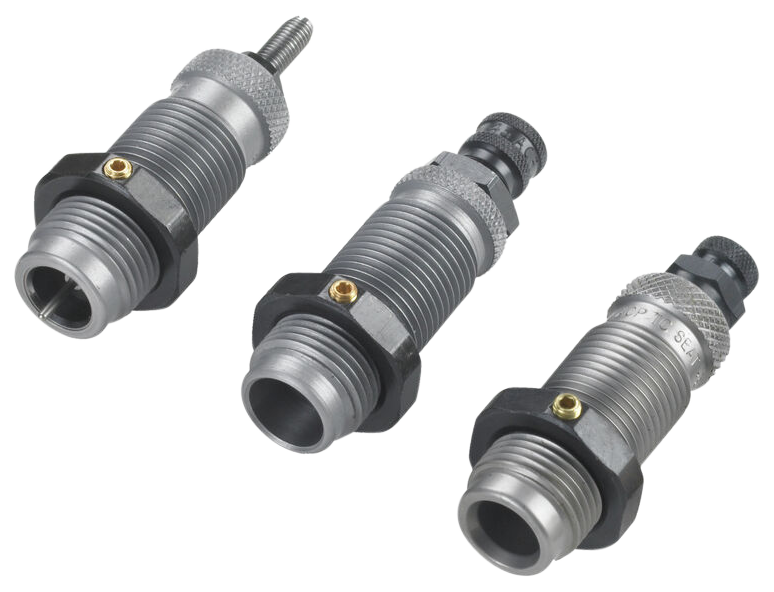 Rcbs pioneered and developed 3-die sets for straight-wall rifle and pistol cases.The carbide sizer die sizes the case and de-primes (the carbide sizer ring eliminates the need to lubricate).The expander die expands the case to the proper diameter to accept the bullet, and it imparts case mouth flare/bell for bullet feeding.The seater die seats the bullet and taper crimps.