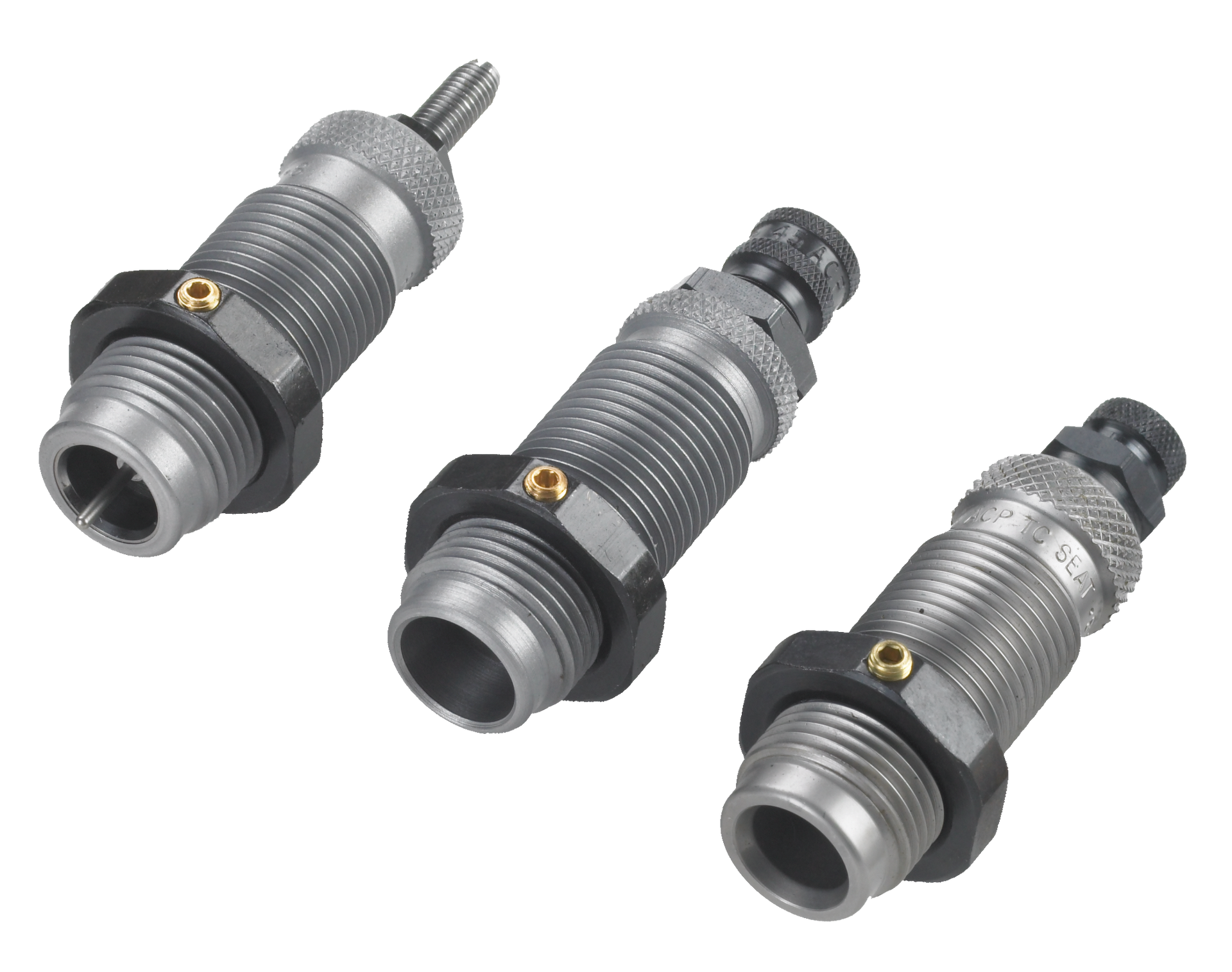 Rcbs's 3-die carbide sets is for straight-wall rifle and pistol cases.The carbide sizer die sizes the case and de-primes (the carbide sizer ring eliminates the need to lubricate).Its expander die expands the case to the proper diameter to accept the bullet, and it imparts case mouth flare/bell for bullet feeding.The seater die seats the bullet and taper crimps.