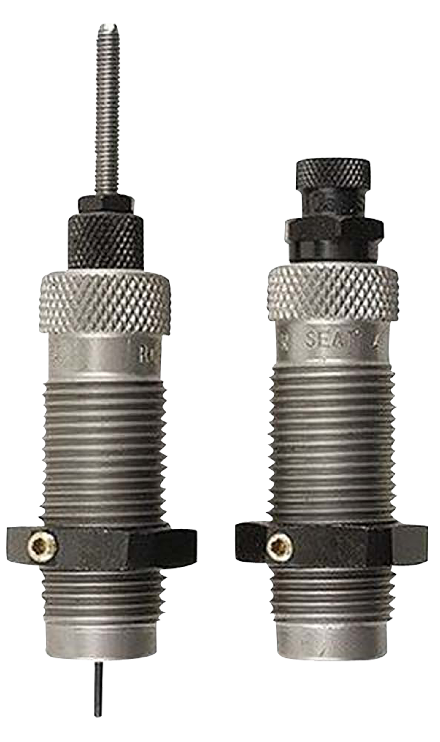 This two-die set is intended for reloading bottleneck cases, and consists of a full-length sizer die with an expander-decapping unit, and a seater die with bullet seater plug.The full-length sizer die brings the case to saami minimum cartridge dimensions.It sizes the outside of the case, de-primes and expands the neck to accept the bullet.The die has vents to prevent case damage caused by trapped air and for excessive lubricant.Headspace is held to minimum tolerances to avoid changing the case body length during full length sizing.The included seater die has a built-in roll crimper to secure the bullet at the same time as it's seated.
